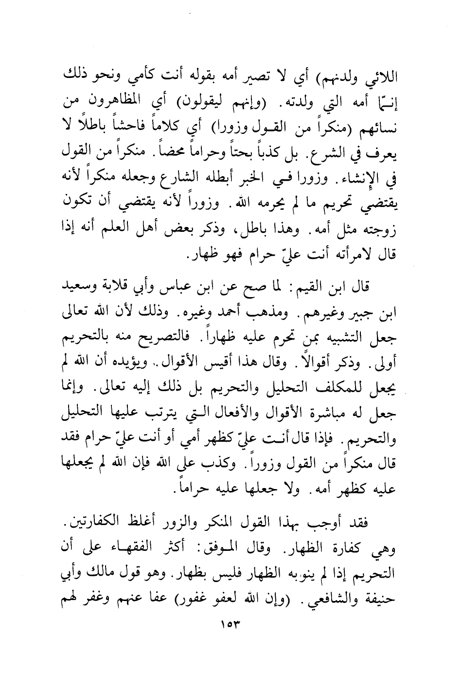 قال ابن القيم: لما صح عن ابن عباس وابي قلابة وسعيد بن جبير وغيرهم، ومذهب أحمد وغيره، وذلك لأن الله تعالى جعل التشبيه بمن تحرم عليه ظهارًا، فالتصريح منه بالتحريم أولى، وذكر أقوالاً، وقال هذا أقيس الأقوال، ويؤيده أن الله لم يجعل للمكلف التحليل والتحريم بل ذلك إليه تعالى، وإنما جعل له مباشرة الأقوال والأفعال التي يترتب عليها التحليل والتحريم، فإذا قال أنت علي كظهر أمي أو أنت علي حرام فقد قال منكرًا من القول وزورًا، وكذب علي الله فإن الله لم يجعلها عليه كظهر أمه، ولا جعلها عليه حرامًا.