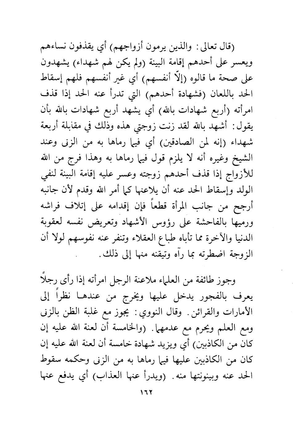 وجوز طائفة من العلماء ملاعنة الرجل امرأته إذا رأى رجلاً يعرف بالفجور يدخل عليها ويخرج من عندها نظرًا إلى الأمارات والقرائن، وقال النووي: يجوز مع غلبة الظن بالزنى ومع العلم ويحرم مع عدمها، (والخامسة أن لعنة الله عليه إن كان من الكاذبين) أي ويزيد شهادة خامسة أن لعنة الله عليه إن كان من الكاذبين عليها فيما رماها به من الزنى وحكمه سقوط الحد عنه وبينونتها منه. {وَيَدْرَأُ عَنْهَا الْعَذَابَ} أي يدفع عنها