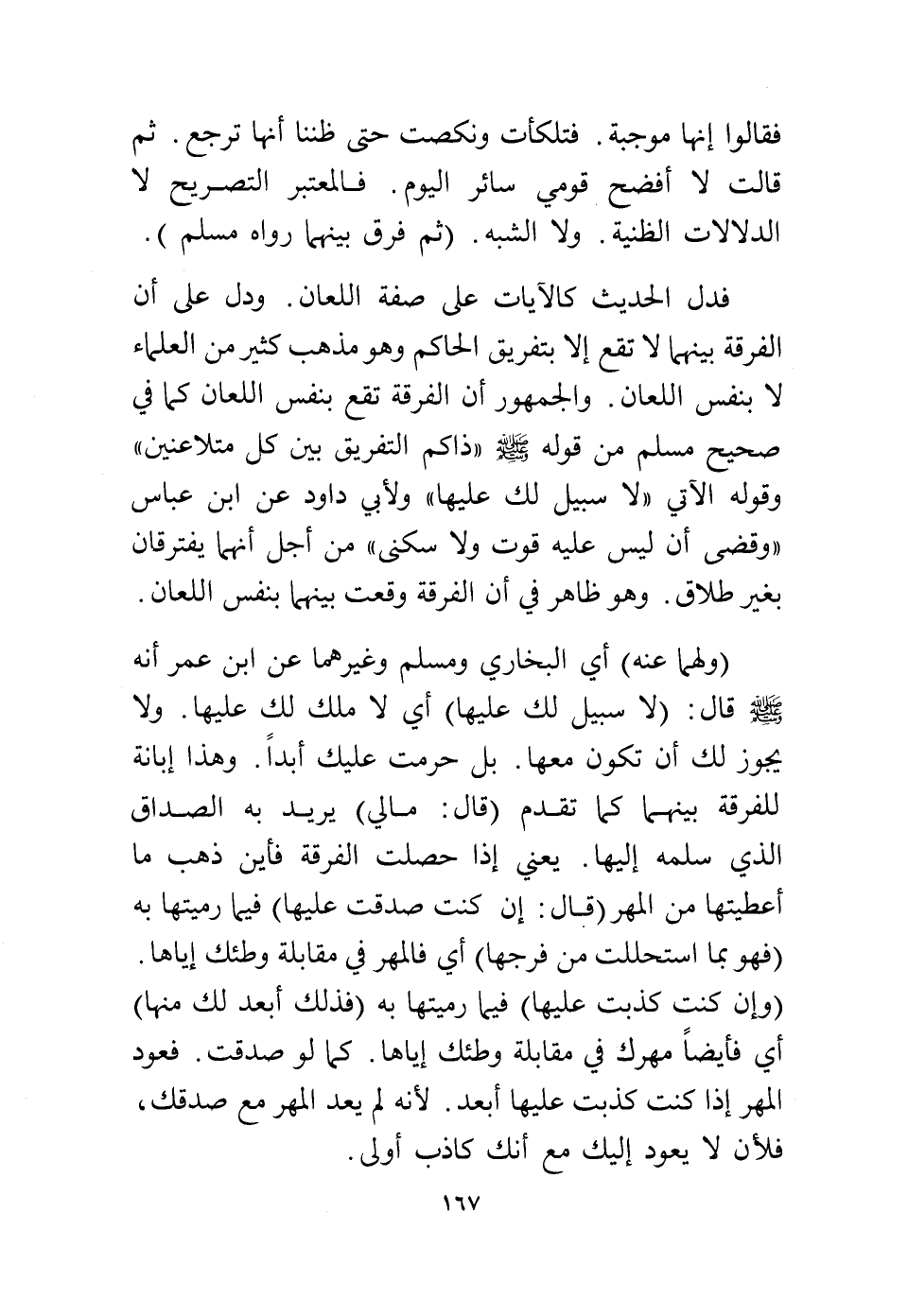 فدل الحديث كالآيات على صفة اللعان، ودل على أن الفرقة بينهما لا تقع إلا بتفريق الحاكم وهو مذهب كثير من العلماء لا بنفس اللعان، والجمهور أن الفرقة تقع بنفس اللعان كما في صحيح مسلم من قوله - صلى الله عليه وسلم - «ذاكم التفريق بين كل متلاعنين» وقوله الآتي «لا سبيل لك عليها» ولأبي داود عن ابن عباس «وقضى أن ليس عليه قوت ولا سكنى» من أجل أنهما يفترقان بغير طلاق، وهو ظاهر في أن الفرقة وقعت بينهما بنفس اللعان.