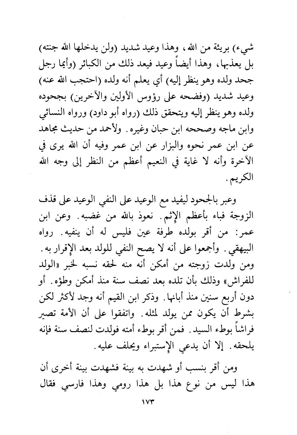 شيء) بريئة من الله، وهذا وعيد شديد (ولن يدخلها جنته) بل يعذبها، وهذا أيضًا وعيد فيعد ذلك من الكبائر «وأيما رجل جحد ولده وهو ينظر إليه» أي يعلم أنه ولده «احتجب الله عنه» وعيد شديد «وفضحه على رءوس الأولين والآخرين» بجحوده ولده وهو ينظر إليه ويتحقق ذلك (رواه أبو داود) ورواه النسائي وابن ماجه وصححه ابن حبان وغيره، ولأحمد من حديث مجاهد عن ابن عمر نحوه والبزار عن ابن عمر، وفيه أن الله يرى في الآخرة وأنه لا غاية في النعيم أعظم من النظر إلى وجه الله الكريم.