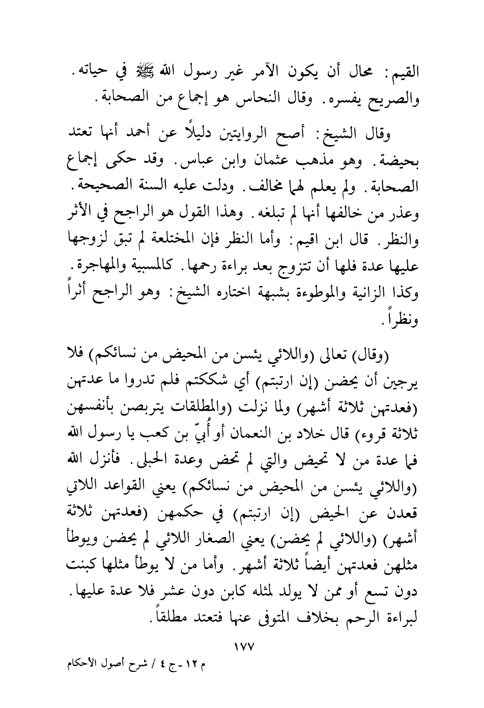 (وقال) تعالى: {وَاللَّائِي يَئِسْنَ مِنَ الْمَحِيضِ مِنْ نِسَائِكُمْ} فلا يرجين أن يحضن {إِنِ ارْتَبْتُمْ} أي شككتم فلم تدروا ما عدتهن {فَعِدَّتُهُنَّ ثَلَاثَةُ أَشْهُرٍ} ولما نزلت {وَالْمُطَلَّقَاتُ يَتَرَبَّصْنَ بِأَنْفُسِهِنَّ ثَلَاثَةَ قُرُوءٍ} قال خلاد بن النعمان أو أبي بن كعب يا رسول الله فما عدة من لا تحيض والتي لم تحض وعدة الحبلى، فأنزل الله {وَاللَّائِي يَئِسْنَ مِنَ الْمَحِيضِ مِنْ نِسَائِكُمْ} يعني القواعد اللاتي قعدن عن الحيض {إِنِ ارْتَبْتُمْ} في حكمهن {فَعِدَّتُهُنَّ ثَلَاثَةُ أَشْهُرٍ} {وَاللَّائِي لَمْ يَحِضْنَ} يعني الصغار اللائي لم يحضن ويوطأ مثلهن فعدتهن أيضًا ثلاثة أشهر، وأما من لا يوطأ مثلها كبنت دون تسع أو ممن لا يولد لمثله كابن دون عشر فلا عدة عليها لبراءة الرحم بخلاف المتوفى عنها فتعتد مطلقًا.
