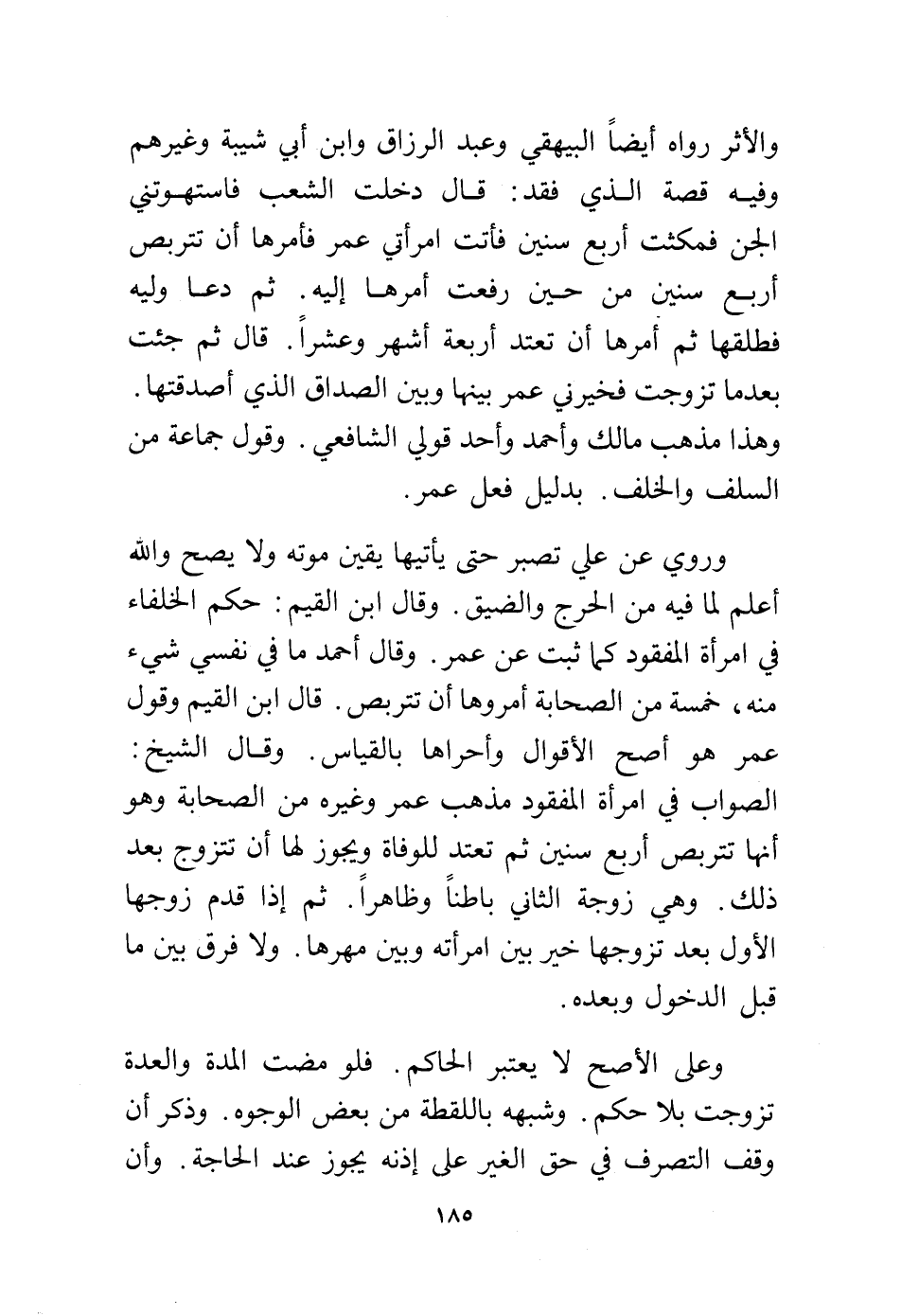 والأثر رواه أيضًا البيهقي وعبد الرزاق وابن أبي شيبة وغيرهم وفيه قصة الذي فقد: قال دخلت الشعب فاستهوتني الجن فمكثت أربع سنين فأتت امرأتي عمر فأمرها أن تتربص أربع سنين من حين رفعت أمرها إليه، ثم دعا وليه فطلقها ثم أمرها أن تعتد أربعة أشهر وعشرًا، قال: ثم جئت بعدما تزوجت فخيرني عمر بينها وبين الصداق الذي أصدقتها وهذا مذهب مالك وأحمد وأحد قولي الشافعي وقول جماعة من السلف والخلف بدليل فعل عمر.