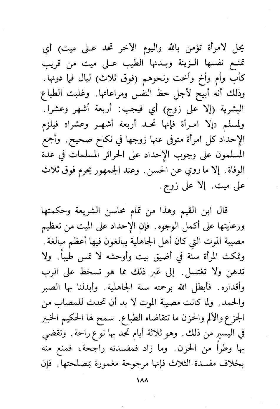 قال ابن القيم وهذا من تمام محاسن الشريعة وحكمتها ورعايتها على أكمل الوجوه، فإن الإحداد على الميت من تطعيم مصيبة الموت التي كان أهل الجاهلية يبالغون فيها أعظم مبالغة وتمكث المرأة سنة في أضيق بيت وأوحشه لا تمس طيبًا، ولا تدهن ولا تغتسل إلى غير ذلك مما هو تسخط على الرب وأقداره، فأبطل الله برحمته سنة الجاهلية، وأبدلنا بها الصبر والحمد، ولما كانت مصيبة الموت لا بد أن تحدث للمصاب من الجزع والألم والحزن مما تتقاضاه الطباع، سمح لها الحكم الخيبر في اليسر من ذلك.