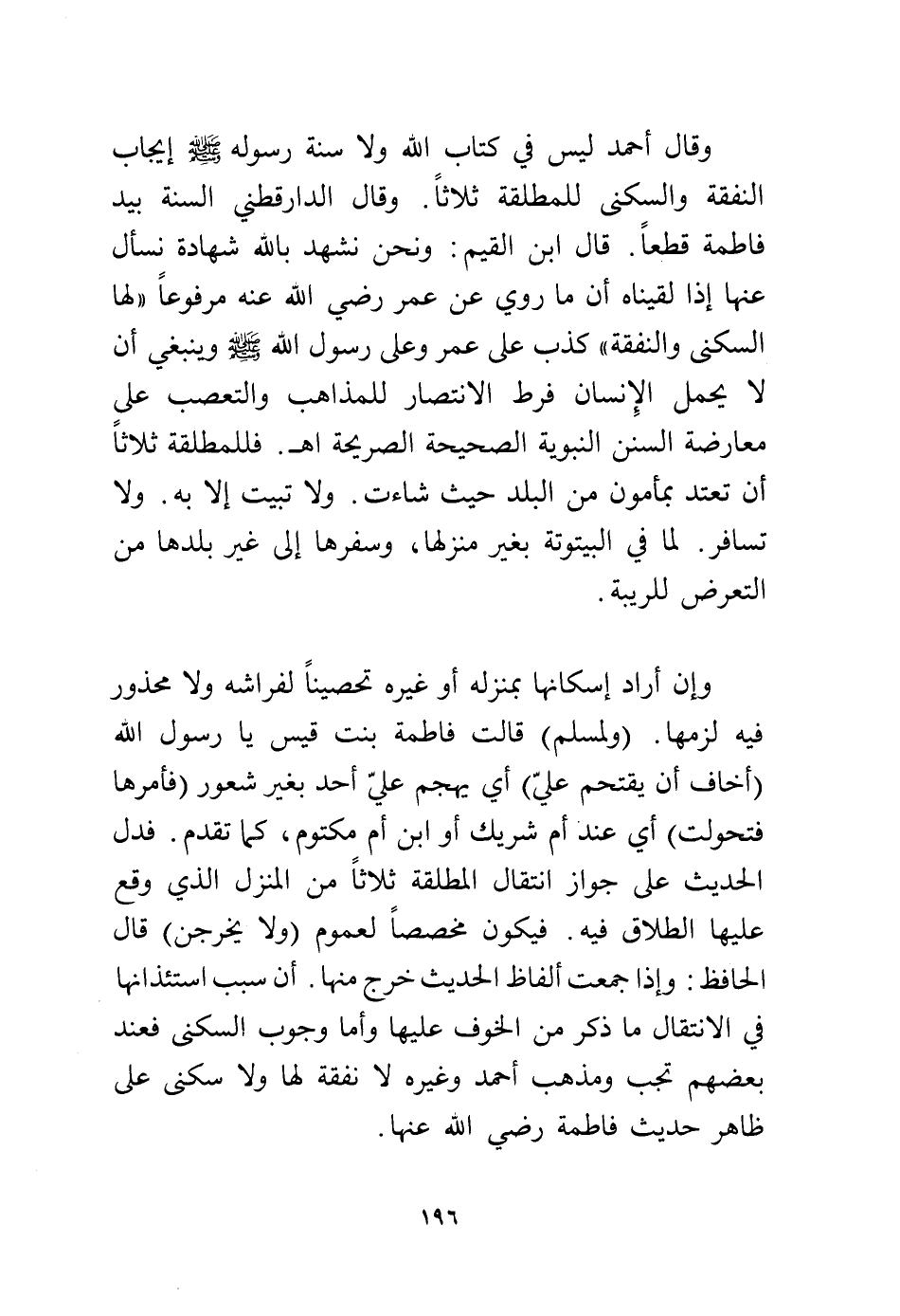 وقال أحمد ليس في كتاب الله ولا سنة رسوله - صلى الله عليه وسلم - إيجاب النفقة والسكنى للمطلقة ثلاثًا وقال الدارقطني السنة بيد فاطمة قطعًا، قال ابن القيم: ونحن نشهد بالله شهادة نسأل عنها إذا لقيناه أن ما روي عن عمر رضي الله عنه مرفوعًا «لها السكنى والنفقة» كذب على عمر وعلى رسول الله - صلى الله عليه وسلم - وينبغي أن لا يحمل الإنسان فرط الانتصار للمذاهب والتعصب على معارضة السنن النبوية الصحيحة الصريحة اهـ، فللمطلقة ثلاثًا أن تعتد بمأمون من البلد حيث شاءت، ولا تبيت إلا به، ولا تسافر، لما في البيتوتة بغير منزلها، وسفرها إلى غير بلدها من التعرض للريبة.