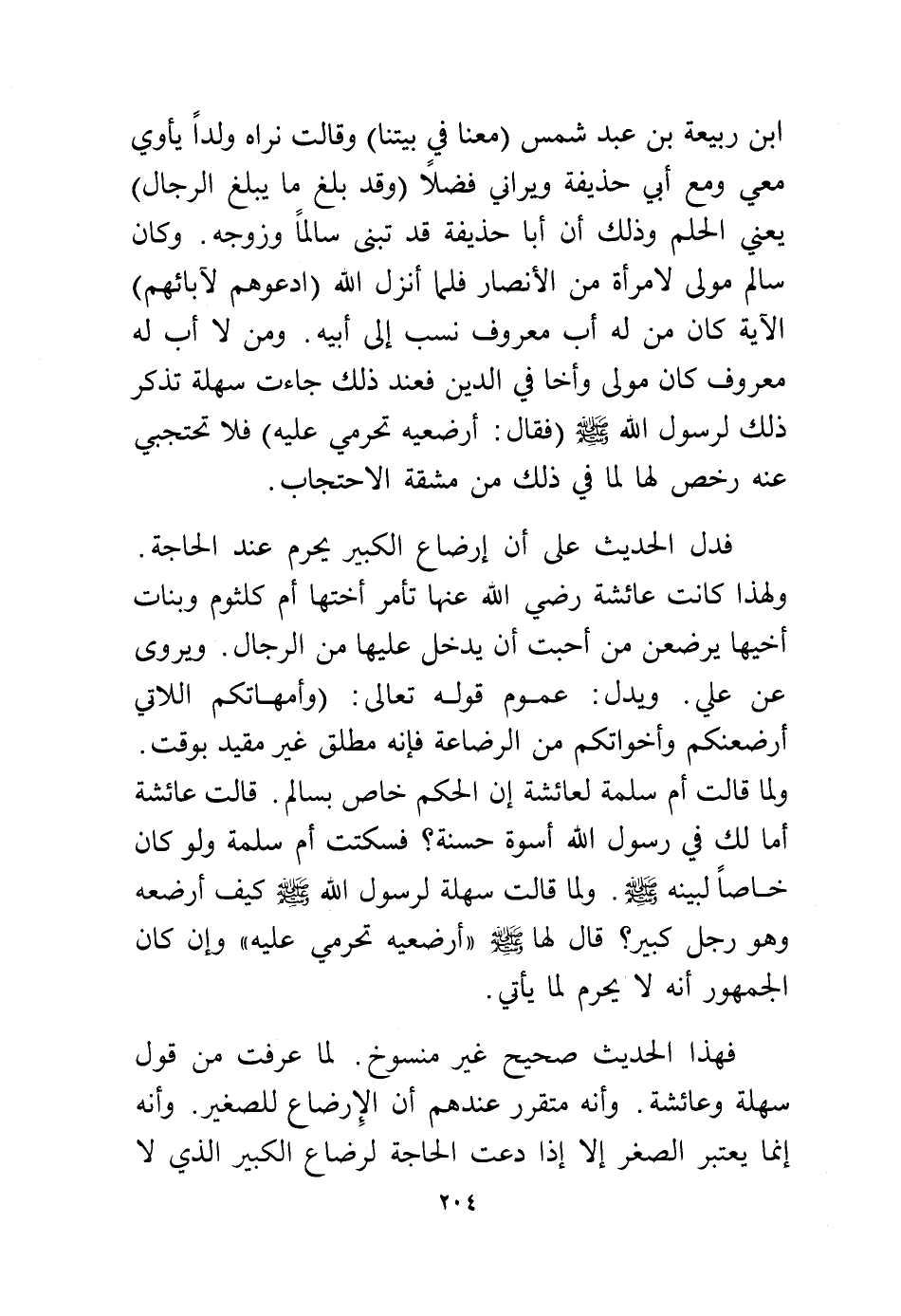 لبينه - صلى الله عليه وسلم - ولما قالت سهلة لرسول الله - صلى الله عليه وسلم - كيف أرضعه وهو رجل كبير؟ قال لها - صلى الله عليه وسلم - «ارضعيه تحرمي عليه وإن كان الجمهور أنه لا يحرم لما يأتي.