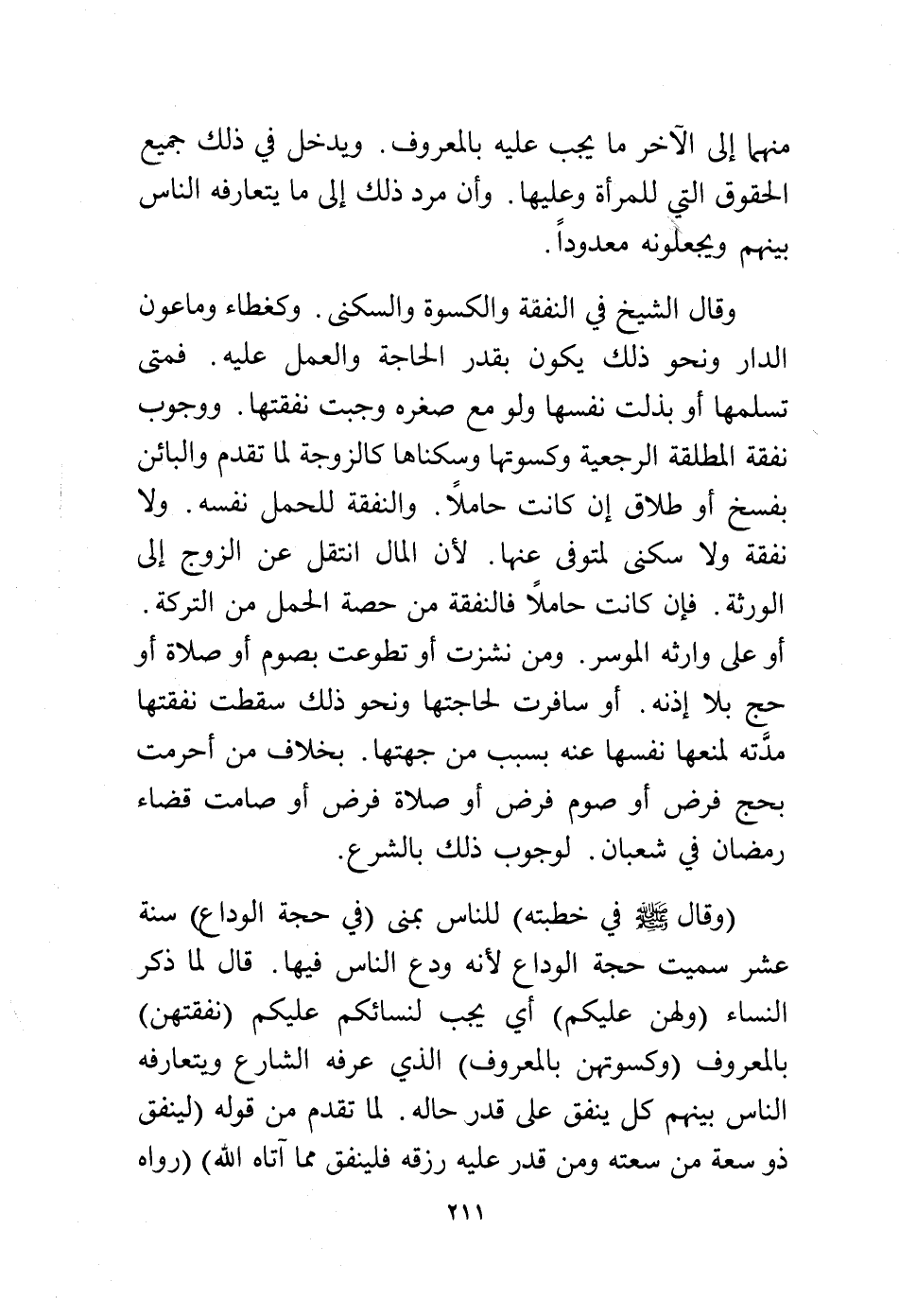 (وقال - صلى الله عليه وسلم - في خطبته) للناس بمنى (في حجة الوداع) سنة عشر سميت حجة الوداع لأنه ودع الناس فيها، قال لما ذكر النساء (ولهن عليكم) أي يجب لنسائكم عليكم (نفقتهن) بالمعروف {وَكِسْوَتُهُنَّ بِالْمَعْرُوفِ} الذي عرفه الشارع ويتعارفه الناس بينهم كل ينفق على قدر حاله، لما تقدم من قوله {لِيُنْفِقْ ذُو سَعَةٍ مِنْ سَعَتِهِ وَمَنْ قُدِرَ عَلَيْهِ رِزْقُهُ فَلْيُنْفِقْ مِمَّا آتَاهُ اللهُ} (رواه