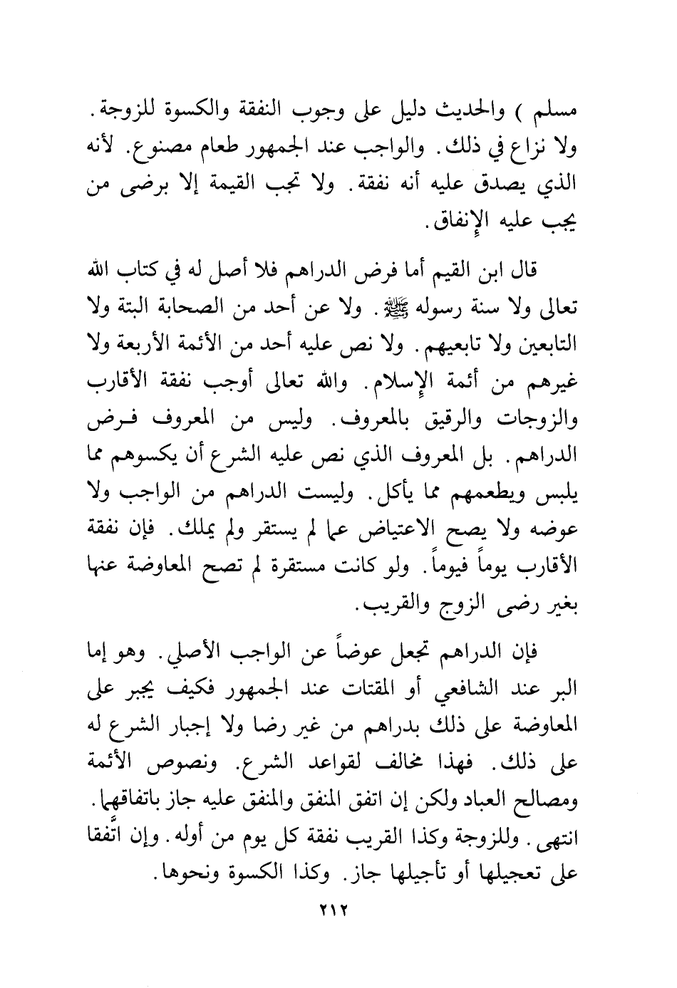 قال ابن القيم أما فرض الدراهم فلا أصل له في كتاب الله تعالى ولا سنة رسوله - صلى الله عليه وسلم -، ولا عن أحد من الصحابة البتة ولا التابعين ولا تابعيهم، ولا نص عليه أحد من الأئمة الأربعة ولا غيرهم من أئمة الإسلام، والله تعالى أوجب نفقة الأقارب والزوجات والرقيق بالمعروف، وليس من المعروف فرض الدراهم، بل المعروف الذي نص عليه الشرع أن يكسوهم مما يلبس ويطعمهم مما يأكل، وليست الدراهم من الواجب ولا عوضه ولا يصح الاعتياض عما لم يستقر ولم يملك، فإن نفقة الأقارب يومًا فيومًا، ولو كانت مستقرة لم تصح المعاوضة عنها بغير رضى الزوج والقريب.