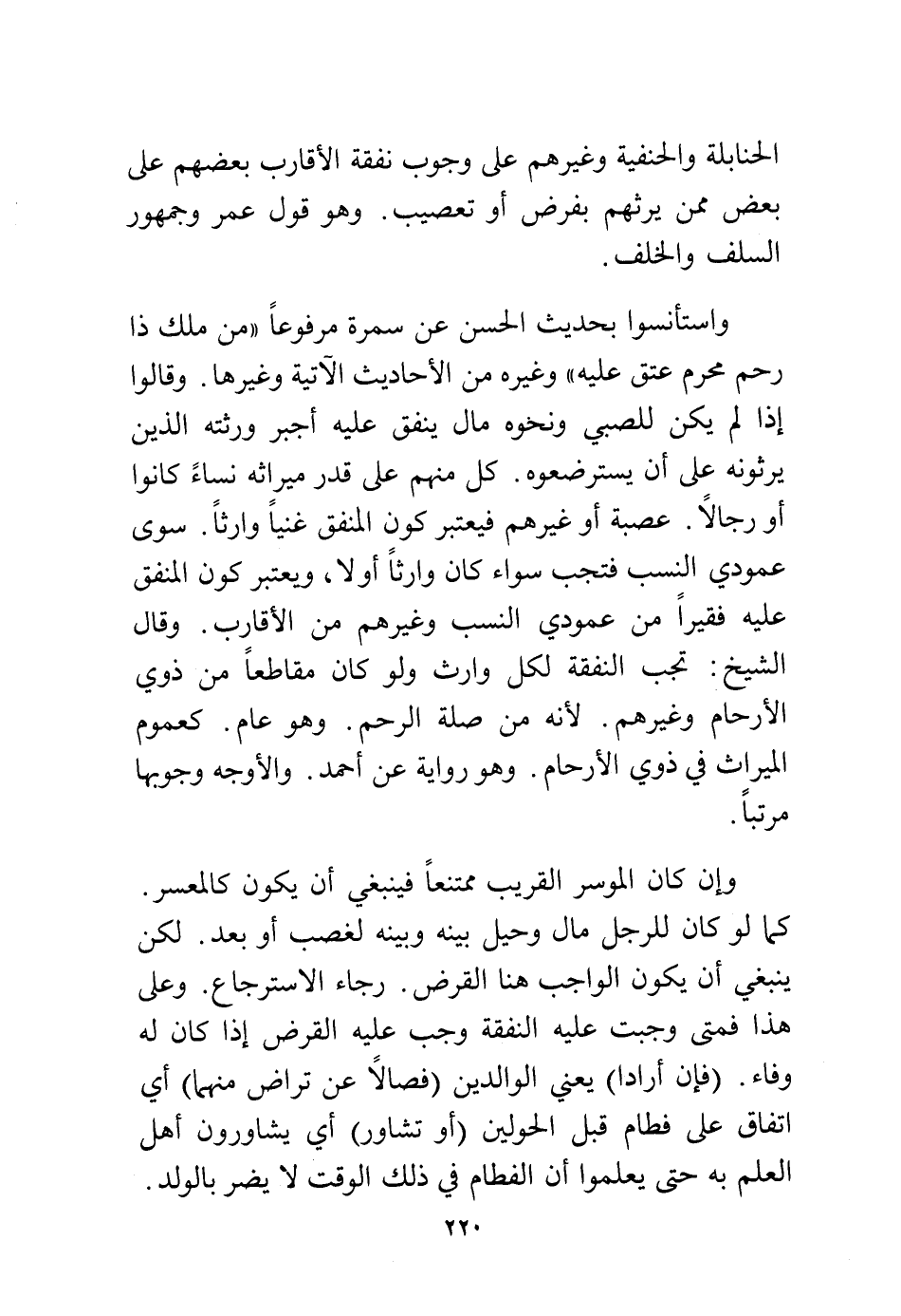 الحنابلة والحنفية وغيرهم على وجوب نفقة الأقارب بعضهم على بعض ممن يرثهم بفرض أو تعصيب. وهو قول عمر وجمهور السلف والخلف.