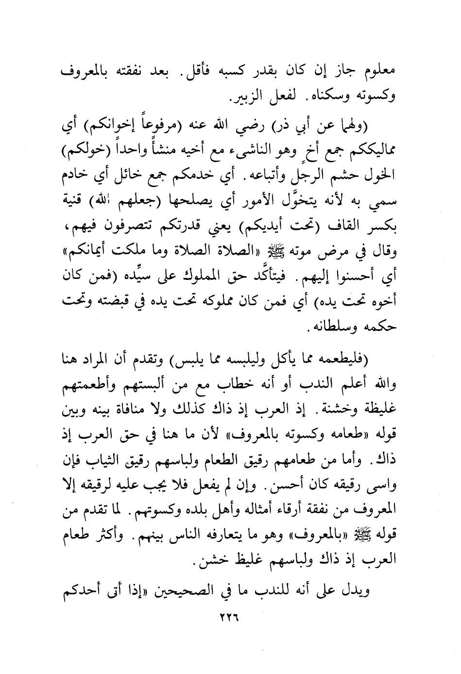 (ولهما عن أبي ذر) رضي الله عنه (مرفوعًا إخوانكم) أي مماليككم جمع أخ وهو الناشئ مع أخيه منشأ واحدًا (خولكم) الخول حشم الرجل وأتباعه، أي خدمكم جمع خائل أي خادم سمي به لأنه يتخول الأمور أي يصلحها (جعلهم الله) قنية بكسر القاف (تحت أيديكم) يعني قدرتكم تتصرفون فيهم، وقال في مرض موته - صلى الله عليه وسلم - «الصلاةَ الصلاةَ وما ملكت أيمانكم» أي أحسنوا إليهم، فيتأكد حق المملوك على سيده (فمن كان أخوه تحت يده) أي فمن كان مملوكه تحت يده في قبضته وتحت حكمه وسلطانه.