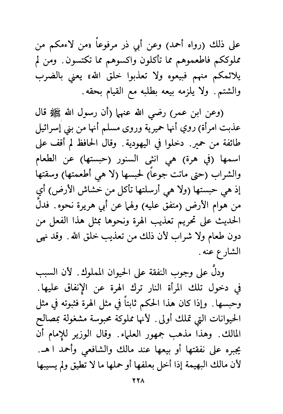 ودل على وجوب النفقة على الحيوان المملوك، لأن السبب في دخول تلك المرأة النار ترك الهرة عن الإنفاق عليها وحبسها، وإذا كان هذا الحكم ثابتًا في مثل الهرة فثبوته في مثل الحيونات التي تملك أولى، لأنها مملوكة محبوسة مشغولة بمصالح المالك، وهذا مذهب جمهور العلماء، وقال الوزير للإمام أن يجبره على نفقتها أو بيعها عند مالك والشافعي وأحمد اهـ. لأن مالك البهيمة إذا أخل بعلفها أو حملها ما لا تطيق ولم يسيبها