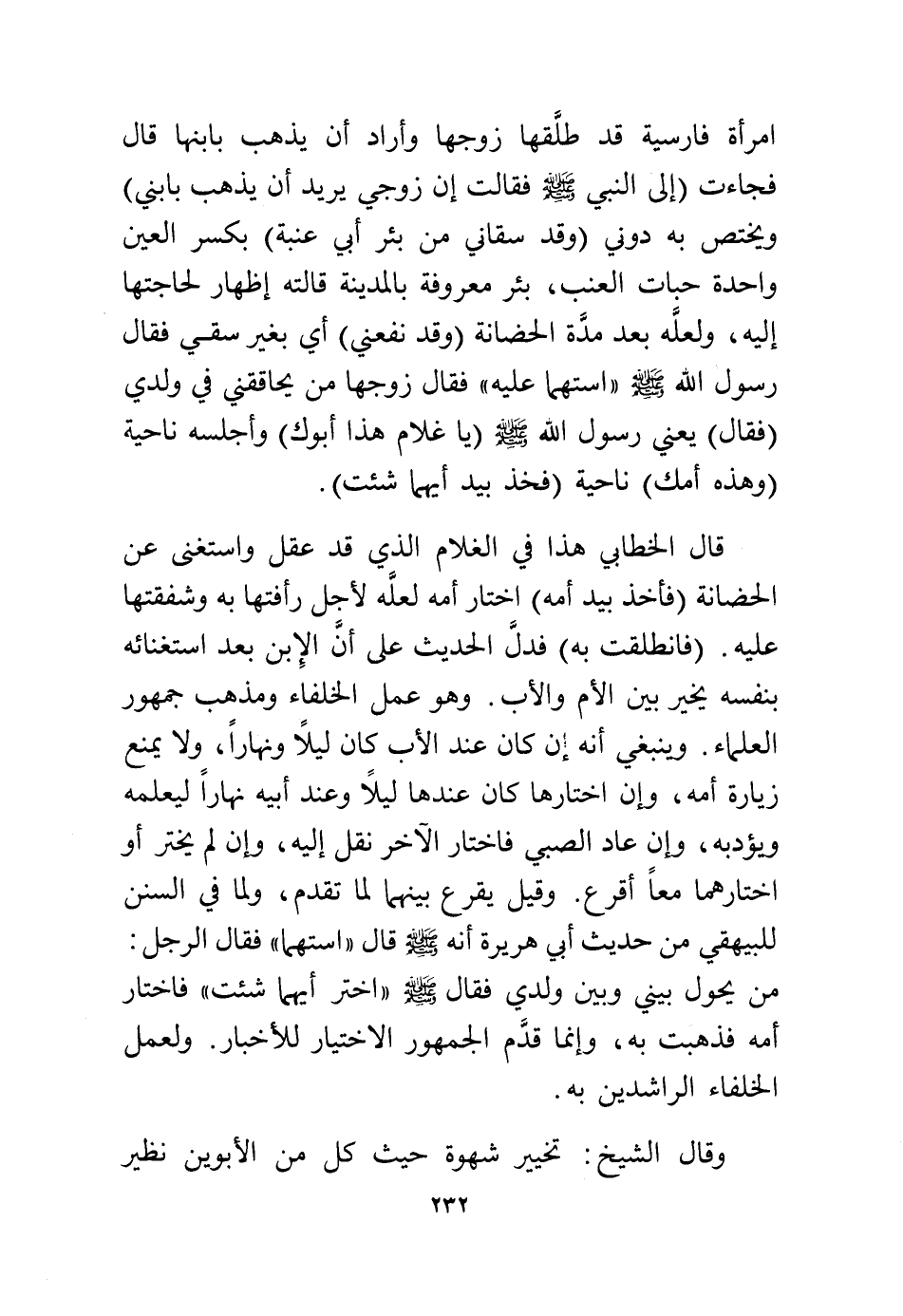 قال الخطابي هذا في الغلام الذي قد عقل واستغنى عن الحضانة (فأخذ بيد أمه) اختار أمه لعله لأجل رأفتها به وشفقتها عليه (فانطلقت به) فدل الحديث على أن الابن بعد استغنائه بنفسه يخير بين الأم والأب، وهو عمل الخلفاء ومذهب جمهور العلماء، وينبغي أنه إن كان عند الأب كان ليلاً ونهارًا، ولا يمنع زيارة أمه، وإن اختارها كان عندها ليلاً وعند أبيه نهارًا ليعلمه ويؤدبه، وإن عاد الصبي فاختار الآخر نقل إليه، وإن لم يختر أو اختارهما معًا أقرع، وقيل يقرع بينهما لما تقدم، ولما في السنن للبيهقي من حديث أبي هريرة أنه - صلى الله عليه وسلم - قال «استهما» فقال الرجل: من يحول بيني وبين ولدي فقال - صلى الله عليه وسلم - «اختر أيهما شئت» فاختار أمه فذهبت به، وإنما قدم الجمهور الاختيار للأخبار، ولعمل الخلفاء الراشدين به.