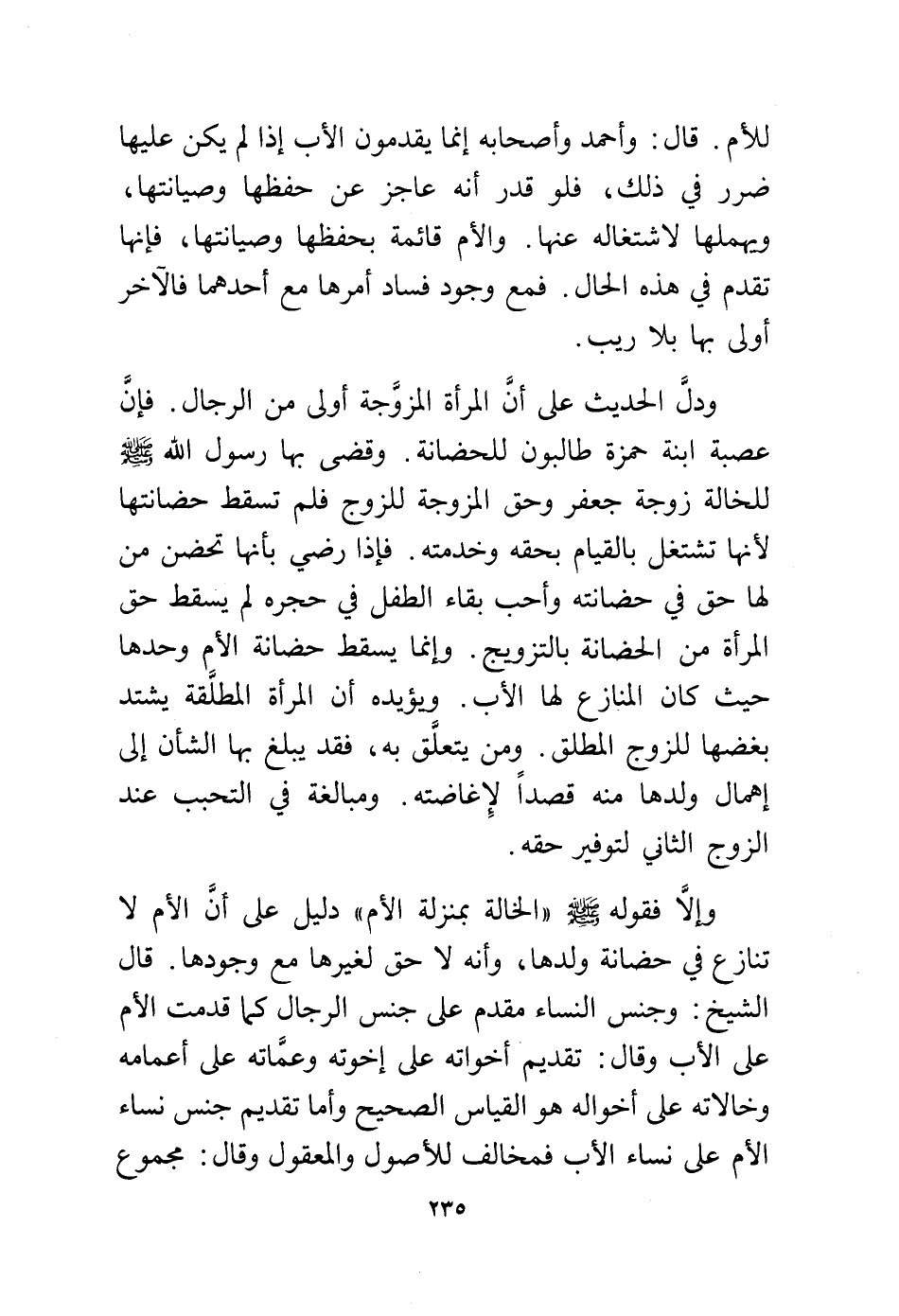 وإلا فقوله - صلى الله عليه وسلم - «الخالة بمنزلة الأم» دليل على أن الأم لا تنازع في حضانة ولدها، وأنه لا حق لغيرها مع وجودها، قال الشيخ: وجنس النساء مقدم على جنس الرجال كما قدمت الأم على الأب، وقال: تقديم أخواته على إخوته وعماته على أعمامه وخالاته على أخواله هو القياس الصحيح وأما تقديم جنس نساء الأم على نساء الأب فمخالف للأصول والمعقول وقال: مجموع
