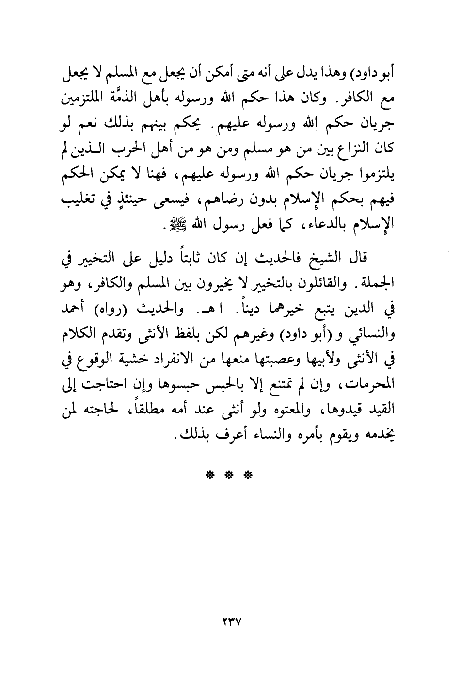 أبو داود) وهذا يدل على أنه متى أمكن أن يجعل مع المسلم لا يجعل مع الكافر، وكان هذا حكم الله ورسوله بأهل الذمة الملتزمين جريان حكم الله ورسوله عليهم، يحكم بينهم بذلك نعم لو كان النزاع بين من هو مسلم ومن هو من أهل الحرب الذين لم يلتزموا جريان حكم الله ورسوله عليهم، فهنا لا يمكن الحكم فيهم بحكم الإسلام بدون رضاهم، فيسعى حينئذ في تغليب الإسلام بالدعاء، كما فعل رسول الله - صلى الله عليه وسلم -.