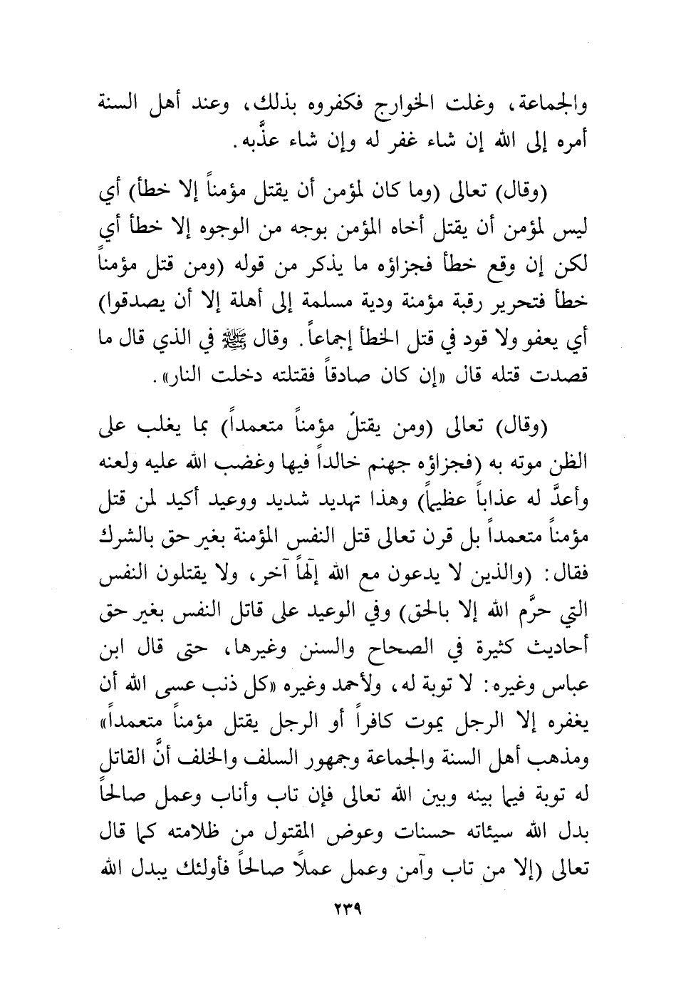 (وقال) تعالى: {وَمَنْ يَقْتُلْ مُؤْمِنًا مُتَعَمِّدًا} بما يغلب على الظن موته به {فَجَزَاؤُهُ جَهَنَّمُ خَالِدًا فِيهَا وَغَضِبَ اللهُ عَلَيْهِ وَلَعَنَهُ وَأَعَدَّ لَهُ عَذَابًا عَظِيمًا *} وهذا تهديد شديد ووعيد أكيد لمن قتل مؤمنًا متعمدًا بل قرن تعالى قتل النفس المؤمنة بغير حق بالشرك فقال: {وَالَّذِينَ لَا يَدْعُونَ مَعَ اللهِ إِلَهًا آخَرَ وَلَا يَقْتُلُونَ النَّفْسَ الَّتِي حَرَّمَ اللهُ إِلَّا بِالْحَقِّ} وفي الوعيد على قاتل النفس بغير حق أحاديث كثيرة في الصحاح والسنن وغيرها، حتى قال ابن عباس وغيره: لا توبة له، ولأحمد وغيره "كل ذنب عسى الله أن يغفره إلا الرجل يموت كافرًا أو الرجل يقتل مؤمناً متعمدًا" ومذهب أهل السنة والجماعة وجمهور السلف والخلف أن القاتل له توبة فيما بينه وبين الله تعالى، فإن تاب وأناب وعمل صالحًا بدل الله سيئاته حسنات وعوض المقتول من ظلامته كما قال تعالى: {إِلَّا مَنْ تَابَ وَآمَنَ وَعَمِلَ عَمَلًا صَالِحًا فَأُولَئِكَ يُبَدِّلُ اللهُ