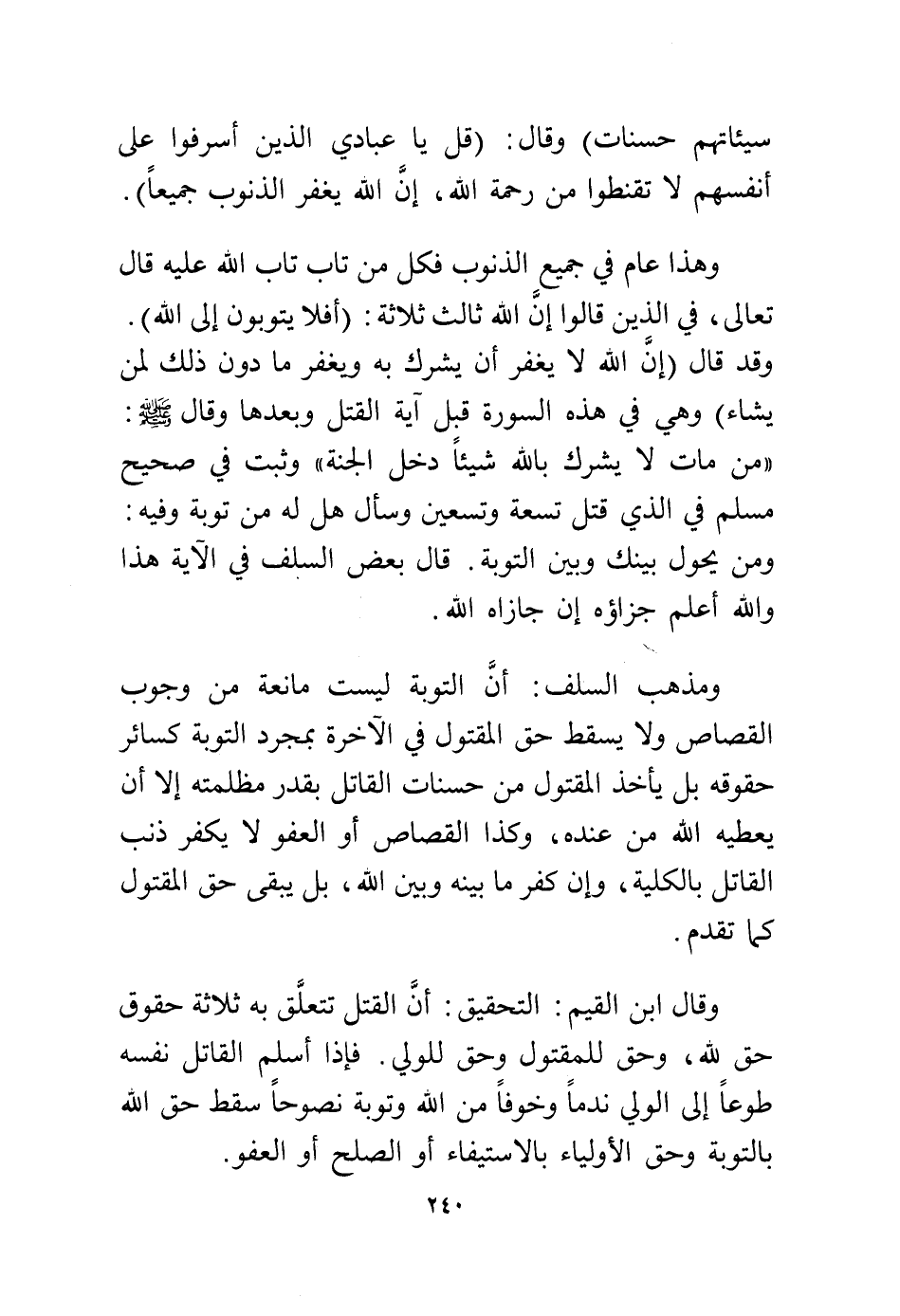 ومذهب أهل السلف: أن التوبة ليست مانعة من وجوب القصاص ولا يسقط حتى المقتول في الآخرة بمجرد التوبة كسائر حقوقه بل يأخذ المقتول من حسنات القاتل بقدر مظلمته إلا أن يعطيه الله من عنده، وكذا القصاص أو العفو لا يكفر ذنب القاتل بالكلية، وإن كفر ما بينه وبين الله، بل يبقى حق المقتول كما تقدم.