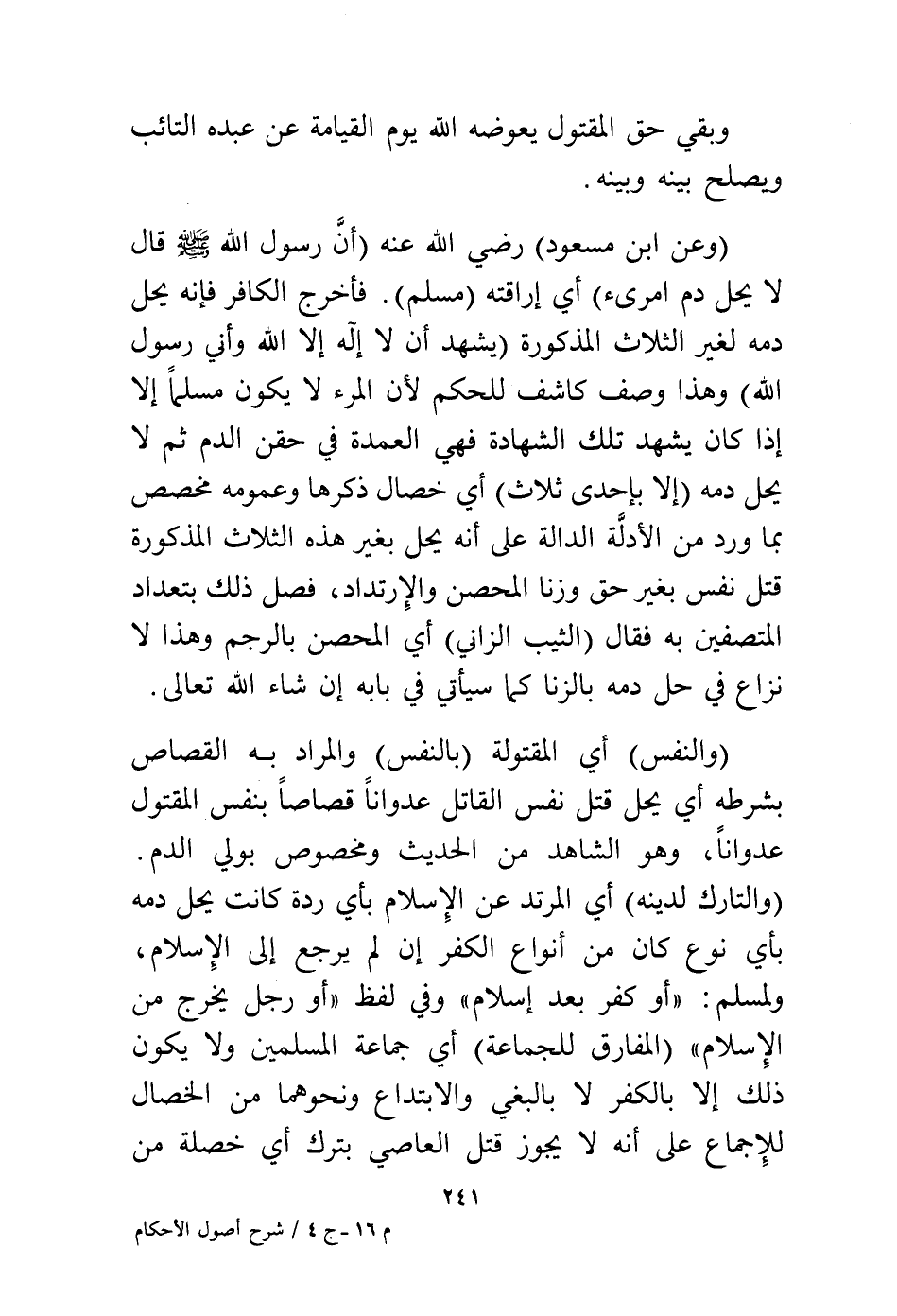 (وعن ابن مسعود) رضي الله عنه (أن رسول الله - صلى الله عليه وسلم - قال: «لا يحل دم امرئ») أي إراقته (مسلم) فأخرج الكافر فإنه يحل دمه لغير الثلاث المذكورة (يشهد أن لا إله إلا الله وأني رسول الله) وهذا وصف كاشف للحكم لأن المرء لا يكون مسلمًا إلا إذا كان يشهد تلك الشهادة فهي العمدة في حقن الدم ثم لا يحل دمه (إلا بإحدى ثلاث) أي خصال ذكرها وعمومه مخصص بما ورد من الأدلة الدالة على أنه يحل بغير هذه الثلاث المذكورة قتل نفس بغير حق وزنا المحصن والارتداد، فصل ذلك بتعداد المتصفين به فقال: (الثيب الزاني) أي المحصن بالرجم وهذا لا نزاع في حل دمه بالزنا كما سيأتي في بابه إن شاء الله تعالى.