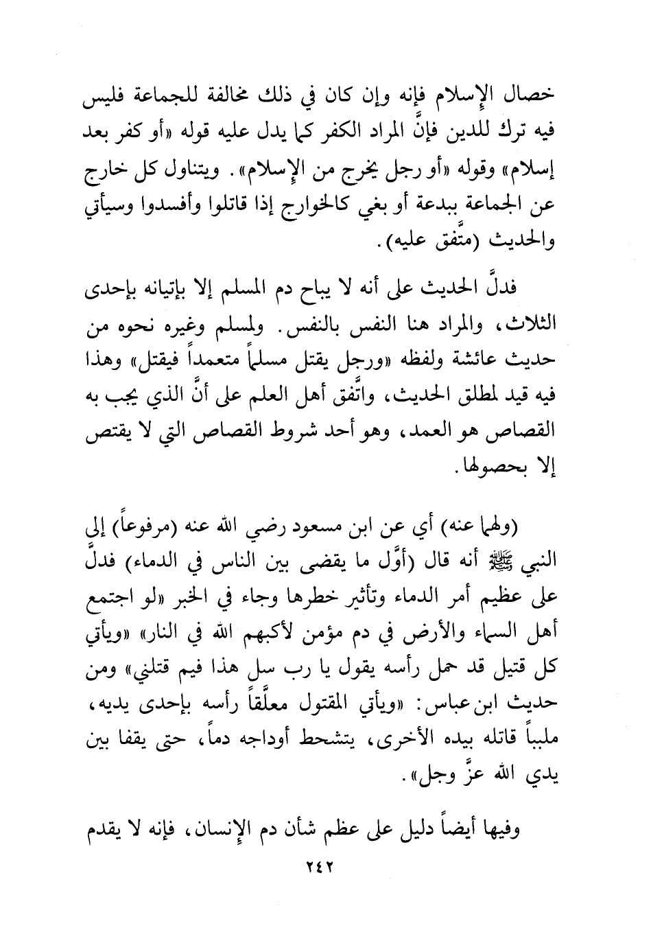 خصال الإسلام فإنه، وإن كان في ذلك مخالفة للجماعة فليس فيه ترك للدين فإن المراد الكفر كما يدل عليه قوله "أو كفر بعد إسلام" وقوله "أو رجل يخرج من الإسلام" ويتناول كل خارج عن الجماعة ببدعة أو بغي كالخوارج إذا قاتلوا وأفسدوا وسيأتي والحديث (متفق عليه).