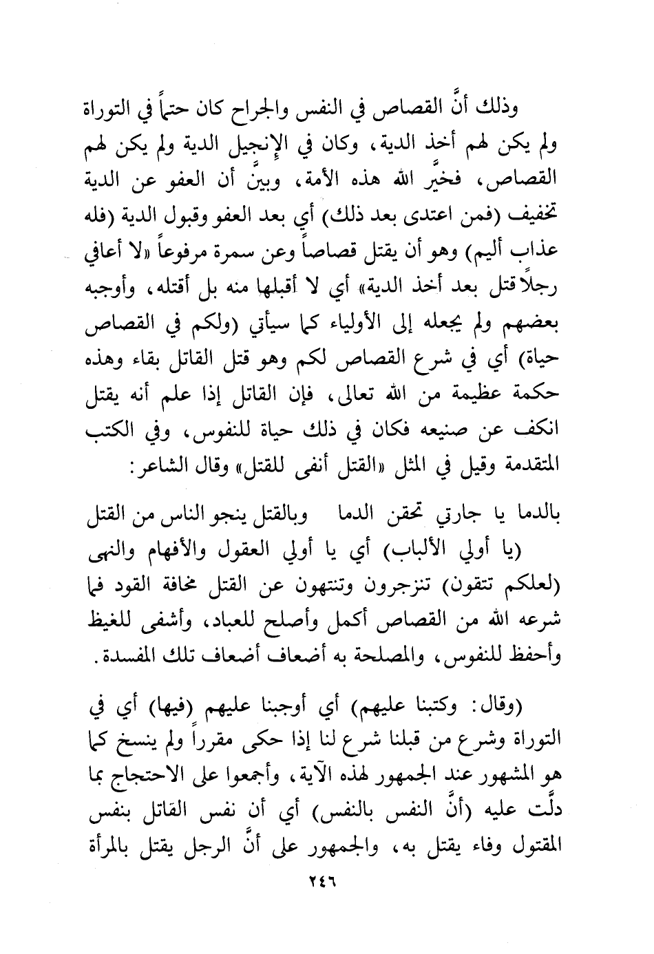(وقال: {وَكَتَبْنَا عَلَيْهِمْ} أي أوجبنا عليهم (فيها) أي في التوراة وشرع من قبلنا شرع لنا إذا حكي مقررًا ولم ينسخ كما هو المشهور عند الجمهور لهذه الآية، وأجمعوا على الاحتجاج بما دلت عليه {أَنَّ النَّفْسَ بِالنَّفْسِ} أي أن نفس القاتل بنفس المقتول وفاءً يقتل به، والجمهور على أن الرجل يقتل بالمرأة