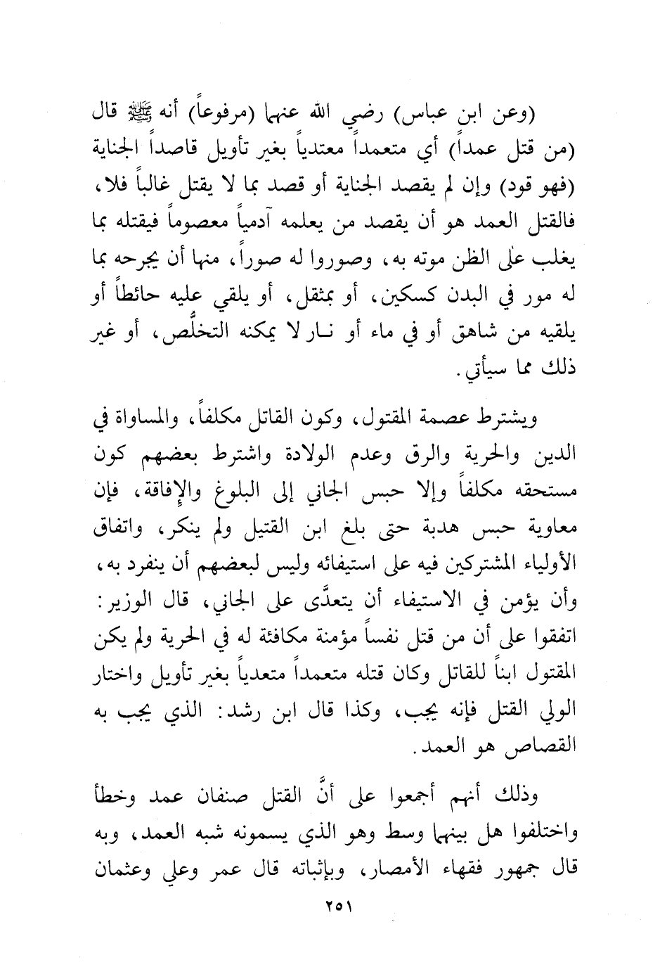 ويشترط عصمة المقتول، وكون القاتل مكلفًا، والمساواة في الدين والحرية والرق وعدم الولادة واشترط بعضهم كون مستحقه مكلفًا وإلا حبس الجاني إلى البلوغ والإفاقة، فإن معاوية حبس هدبة حتى بلغ ابن القتيل ولم ينكر، واتفاق الأولياء المشتركين فيه على استيفائه وليس لبعضهم أن ينفرد به، وأن يؤمن في الاستيفاء أن يتعدى على الجاني، قال الوزير: اتفقوا على أن من قتل نفسًا مؤمنة مكافئة له في الحرية ولم يكن المقتول ابنًا للقاتل وكان قتله متعمدًا متعديًا بغير تأويل واختار الولي القتل فإنه يجب، وكذا قال ابن رشد: الذي يجب به القصاص هو العمد.