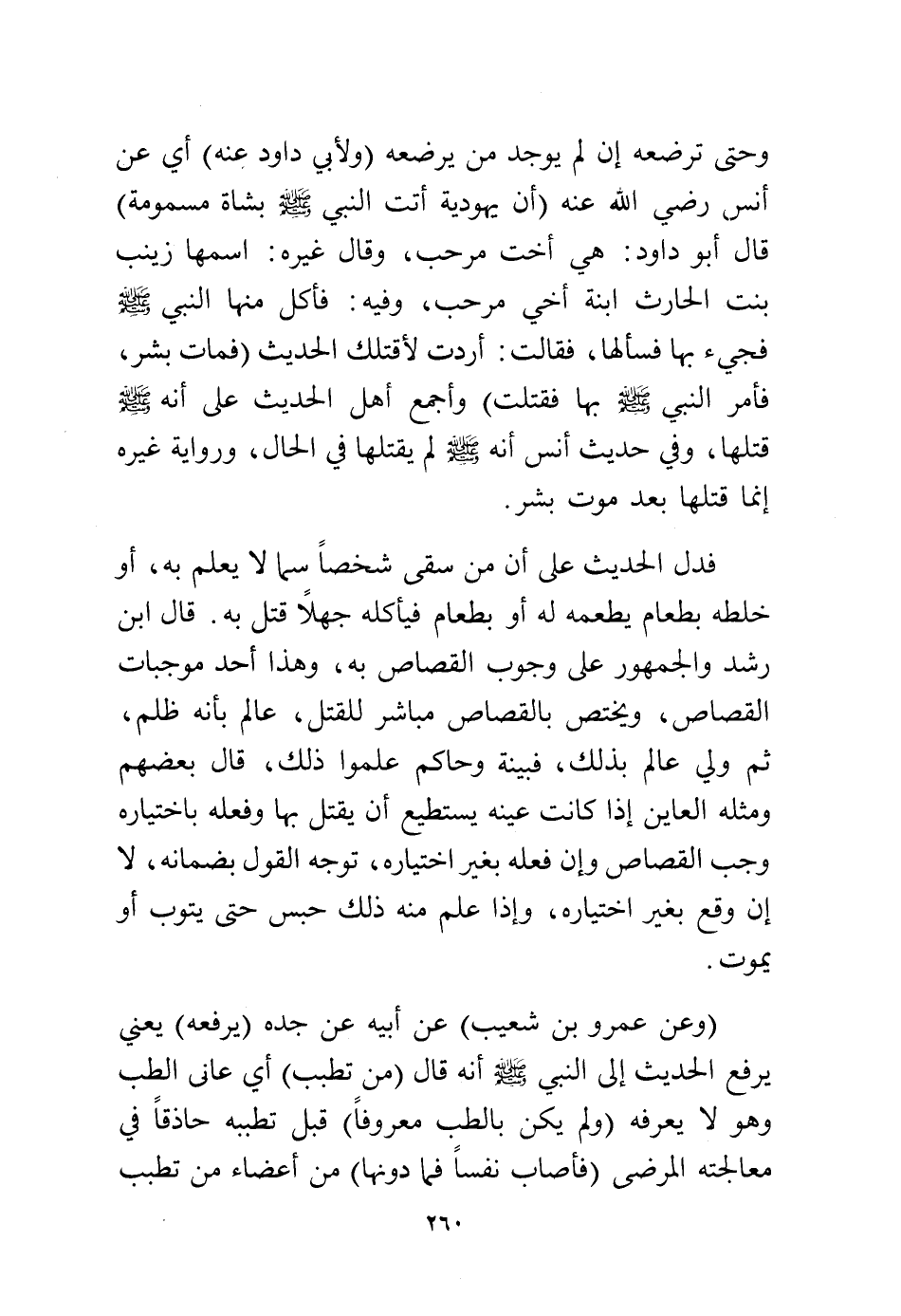 فدل الحديث على أن من سقى شخصًا سما لا يعلم به، أو خلطه بطعام يطعمه له أو بطعام فيأكله جهلاً قتل به، قال ابن رشد والجمهور على وجوب القصاص به، وهذا أحد موجبات القصاص، ويختص بالقصاص مباشر للقتل، عالم بأنه ظلم، ثم ولي عالم بذلك، فبينة وحاكم علموا ذلك قال بعضهم ومثله العاين إذا كانت عينه يستطيع أن يقتل بها وفعله باختياره وجب القصاص وإن فعله بغير اختياره توجه القول بضمانه، لا إن وقع بغير اختياره، وإذا علم منه ذلك حبس حتى يتوب أو يموت.