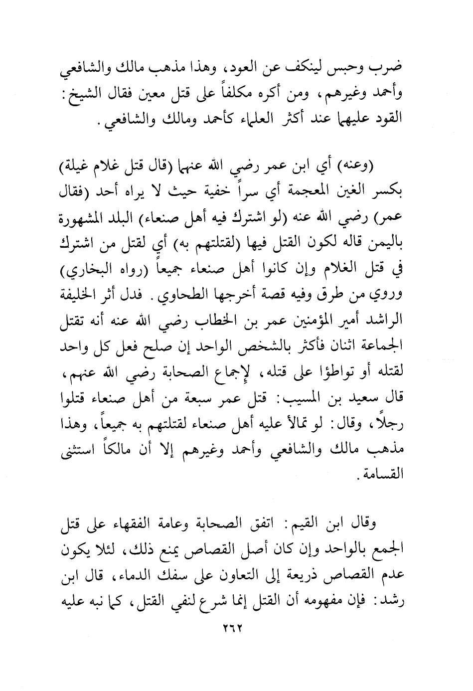 (وعنه) أي ابن عمر رضي الله عنهما (قال قتل غلامًا غيلة) بكسر الغين المعجمة أي سرًا خفية حيث لا يراه أحد (فقال عمر) رضي الله عنه (لو اشترك فيه أهل صنعاء) البلد المشهورة باليمن قاله لكون القتل فيها (لقتلتهم به) أي لقتل من اشترك في قتل الغلام وإن كانوا أهل صنعاء جميعًا (رواه البخاري) وروي من طرق وفيه قصة أخرجها الطحاوي، فدل أثر الخليفة الراشد أمير المؤمنين عمر بن الخطاب رضي الله عنه أنه تقتل الجماعة اثنان فأكثر بالشخص الواحد إن صلح فعل كل واحد لقتله أو تواطؤا على قتله، لإجماع الصحابة رضي الله عنهم،