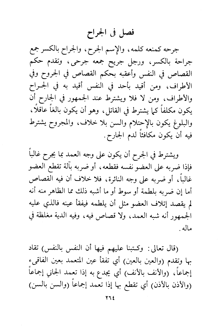 جرحه كمنعه كلمه، والاسم الجرح، والجراح بالكسر جمع جراحة بالكسر، ورجل جريح جمعه جرحى، وتقدم حكم القصاص في النفس وأعقبه بحكم القصاص في الجروح وفي الأطراف، ومن أقيد بأحد في النفس أقيد به في الجراح والأطراف، ومن لا فلا ويشترط عند الجمهور في الجارح أن يكون مكلفًا كما يشترط في القاتل، وهو أن يكون بالغًا عاقلاً، والبلوغ يكون بالاحتلام والسن بلا خلاف، والمجروح يشترط فيه أن يكون مكافئًا لدم الجارح.