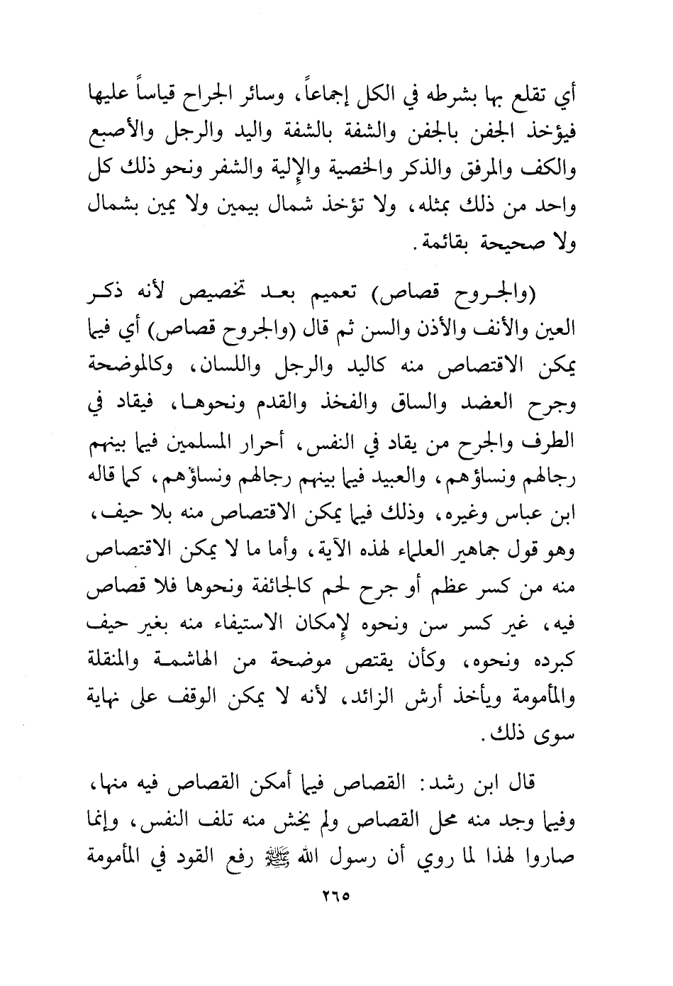 (والجروح قصاص) تعميم بعد تخصيص لأنه ذكر العين والأنف والأذن والسن ثم قال {وَالْجُرُوحَ قِصَاصٌ} أي فيما يمكن الاقتصاص منه كاليد والرجل واللسان، وكالموضحة وجرح العضد والساق والفخذ والقدم ونحوها، فيقاد في الطرف والجرح من يقاد في النفس، أحرار المسلمين فيما بينهم رجالهم ونساؤهم والعبيد فيما بينهم رجالهم ونساؤهم كما قاله ابن عباس وغيره، وذلك فيما يمكن الاقتصاص منه بلا حيف، وهو قول جماهير العلماء لهذه الآية، وأما ما لا يمكن الاقتصاص منه من كسر عظم أو جرح لحم كالجائفة ونحوها فلا قصاص فيه، غير كسر سن ونحوه لإمكان الاستيفاء منه بغير حيف، كبرده ونحوه، وكأن يقتص موضحة من الهاشمة والمنقلة والمأمومة ويأخذ أرش الزائد، لأنه لا يمكن الوقف على نهاية سوى ذلك.