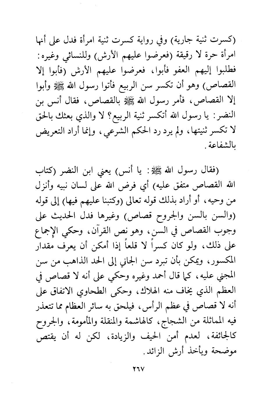 (كسرت ثنية جارية) وفي رواية كسرت ثنية امرأة فدل على أنها امرأة حرة لا رقيقة (فعرضوا عليهم الأرش) وللنسائي وغيره: فطلبوا إليهم العفو فأبوا، فعرضوا عليهم الأرش (فأبوا إلا القصاص) وهو أن تكسر سن الرُبَيع فأتوا رسول الله - صلى الله عليه وسلم - وأبو إلا القصاص، فأمر رسول الله - صلى الله عليه وسلم - بالقصاص فقال أنس بن النضر: يا رسول الله أتكسر ثنية الربيع؟ لا والذي بعثك بالحق لا تكسر ثنيتها، ولم يرد رد الحكم الشرعي، وإنما أراد التعريض