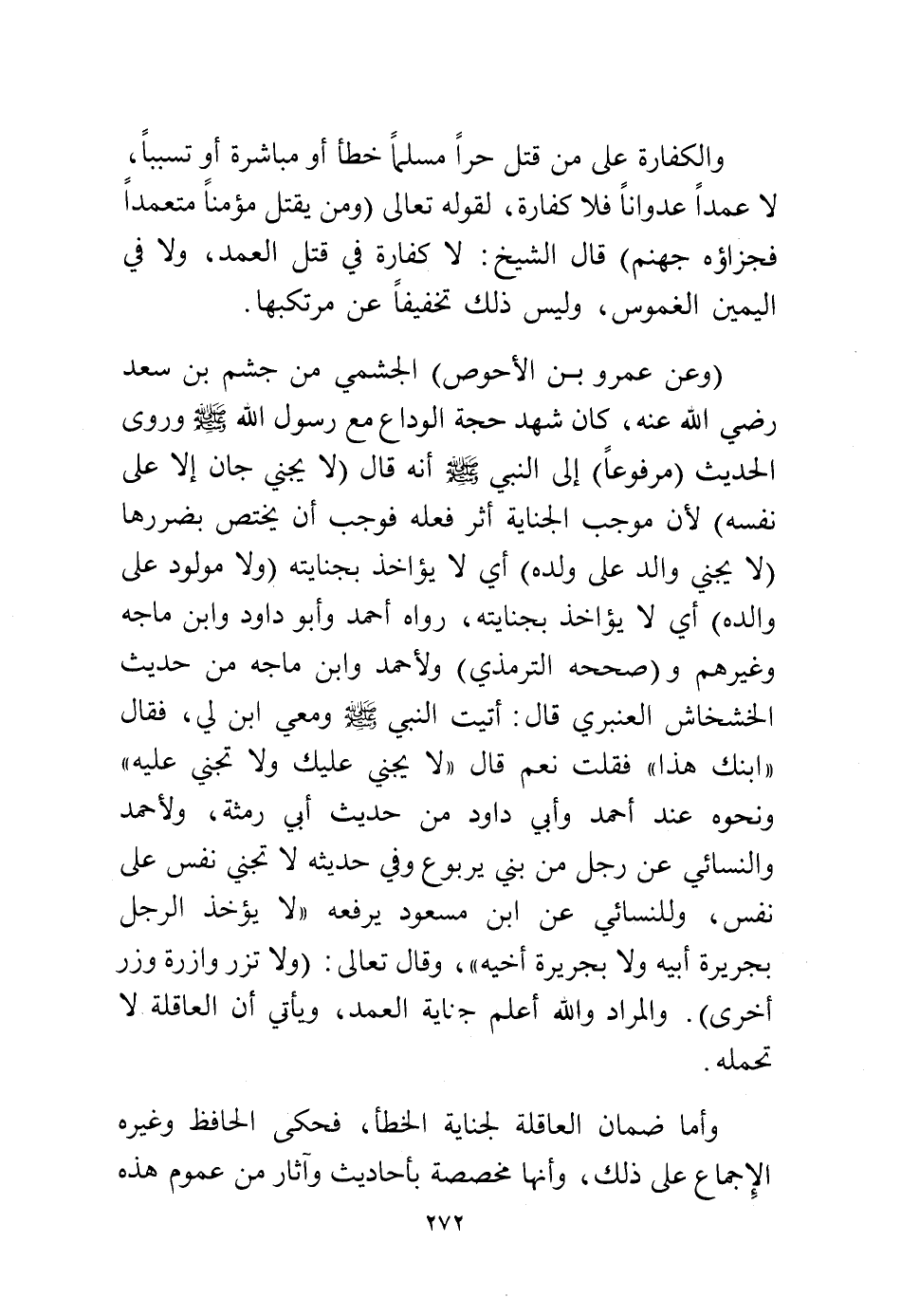 (وعن عمرو بن الأحوص) الجشمي من حشم بن سعد رضي الله عنه، كان شهد حجة الوداع مع رسول الله - صلى الله عليه وسلم - وروى الحديث (مرفوعًا) إلى النبي - صلى الله عليه وسلم - أنه قال: «لا يجني جان إلا على نفسه» لأن موجب الجناية أثر فعله فوجب أن يختص بضررها «لا يجني والد على ولده» أي لا يؤاخذ بجنايته «ولا مولود على والده» أي لا يؤاخذ بجنايته، رواه أحمد وأبو داود وابن ماجه وغيرهم و (صححه الترمذي) ولأحمد وابن ماجه من حديث الخشخاش العنبري قال: أتيت النبي - صلى الله عليه وسلم - ومعي ابن لي، فقال «ابنك هذا» فقلت نعم قال: «لا يجني عليك ولا تجني عليه» ونحوه عند أحمد وأبي داود من حديث أبي رمثة، ولأحمد والنسائي عن رجل من بني يربوع وفي حديثه لا تجني نفس على نفس، وللنسائي عن ابن مسعود يرفعه «لا يؤخذ الرجل بجريرة أبيه ولا بجريرة أخيه» وقال تعالى: {لَا تَزِرُ وَازِرَةٌ وِزْرَ أُخْرَى} والمراد والله أعلم جناية العمد، ويأتي أن العاقلة لا تحمله.