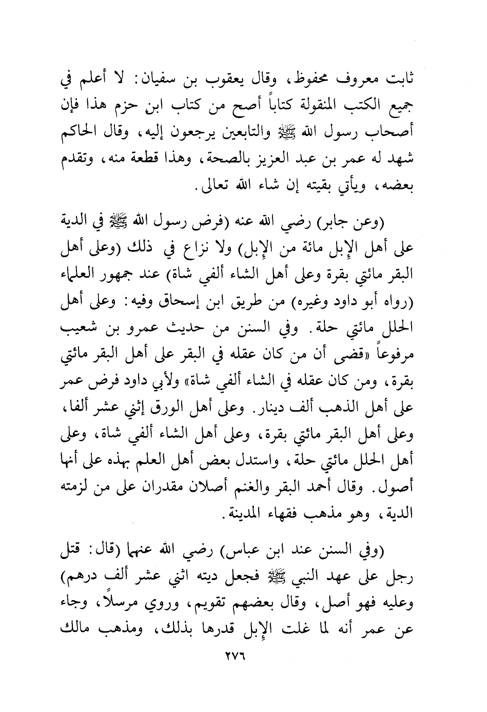(وعن جابر) رضي الله عنه (فرض رسول الله - صلى الله عليه وسلم - في الدية على أهل الإبل مائة من الإبل) ولا نزاع في ذلك (وعلى أهل البقر مائتي بقرة وعلى أهل الشاء ألفي شاة) عند جمهور العلماء (رواه أبو داود وغيره) من طريق ابن إسحاق وفيه: وعلى أهل الحلل مائتي حلة، وفي السنن من حديث عمرو بن شعيب مرفوعًا «قضى أن من كان عقله في البقر على أهل البقر مائتي بقرة، ومن كان عقله في الشاء ألفي شاة» ولأبي داود فرض عمر على أهل الذهب ألف دينار. وعلى أهل الورق إثني عشر ألفًا، وعلى أهل البقر مائتي بقرة، وعلى أهل الشاء ألفي شاة، وعلى أهل الحلل مائتي حلة، واستدل بعض أهل العلم بهذه على أنها أصول، وقال أحمد البقر والغنم أصلان مقدران على من لزمته الدية، وهو مذهب فقهاء المدينة.