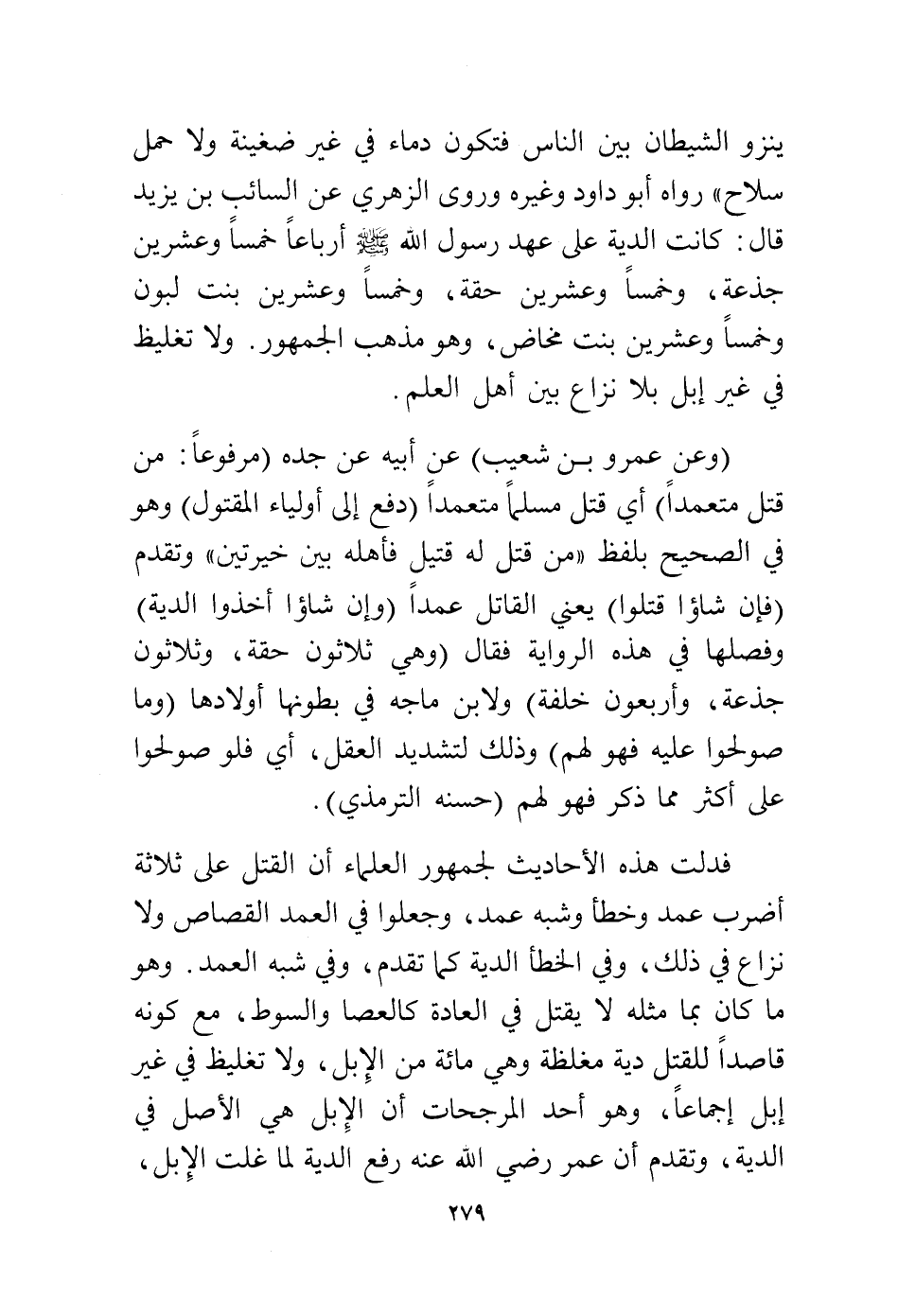 فدلت هذه الأحاديث لجمهور العلماء أن القتل على ثلاثة أضرب عمدٌ وخطأٌ وشبهُ عمدٍ، وجعلوا في العمد القصاص ولا نزاع في ذلك، وفي الخطأ الدية كما تقدم، وفي شبه العمد وهو ما كان بما مثله لا يقتل في العادة كالعصا، والسوط، مع كونه قاصدًا للقتل دية مغلظة وهي مائة من الإبل، ولا تغليظ في غير إبل إجماعًا، وهو أحد المرجحات أن الإبل هي الأصل في الدية، وتقدم أن عمر رضي الله عنه رفع الدية لما غلت الإبل،