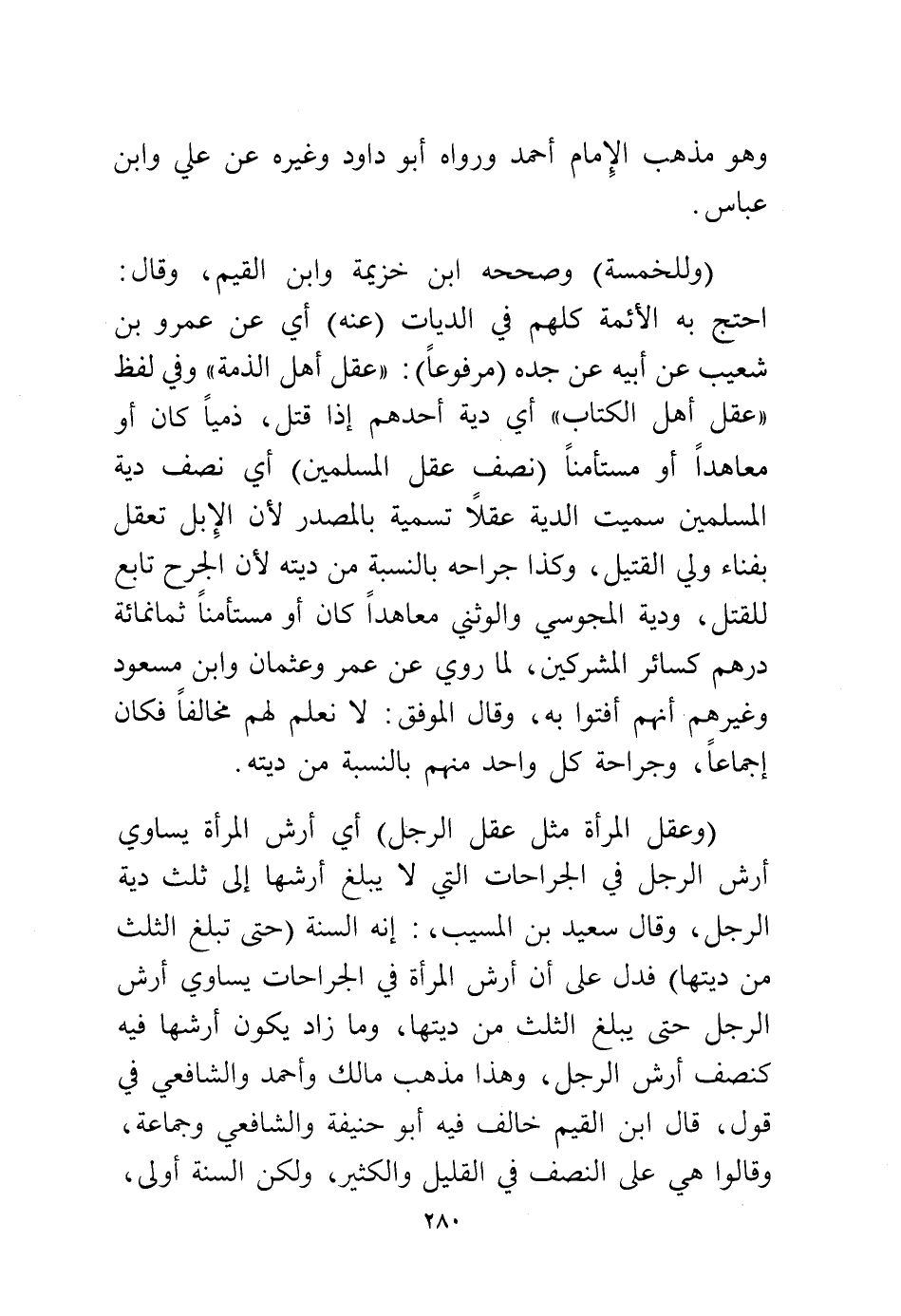 (وللخمسة) وصححه ابن خزيمة وابن القيم، وقال: احتج به الأئمة كلهم في الديات (عنه) أي عن عمرو بن شعيب عن أبيه، عن جده (مرفوعًا) عقل أهل الذمة، وفي لفظ "عقل أهل الكتاب" أي دية أحدهم إذا قتل، ذميًا كان أو معاهدًا أو مستأمنًا (نصف عقل المسلمين) أي نصف دية المسلمين سميت الدية عقلاً تسمية بالمصدر لأن الإبل تعقل بفناء ولي القتيل، وكذا جراحه بالنسبة من ديته لأن الجرح تابع للقتل، ودية المجوسي والوثني معاهدًا كان أو مستأمنًا ثمان مائة درهم كسائر المشركين، لما روي عن عمر، وعثمان وابن مسعود وغيرهم أنهم أفتوا به، وقال الموفق: لا نعلم لهم مخالفًا فكان إجماعًا وجراحة كل واحد منهم بالنسبة من ديته.