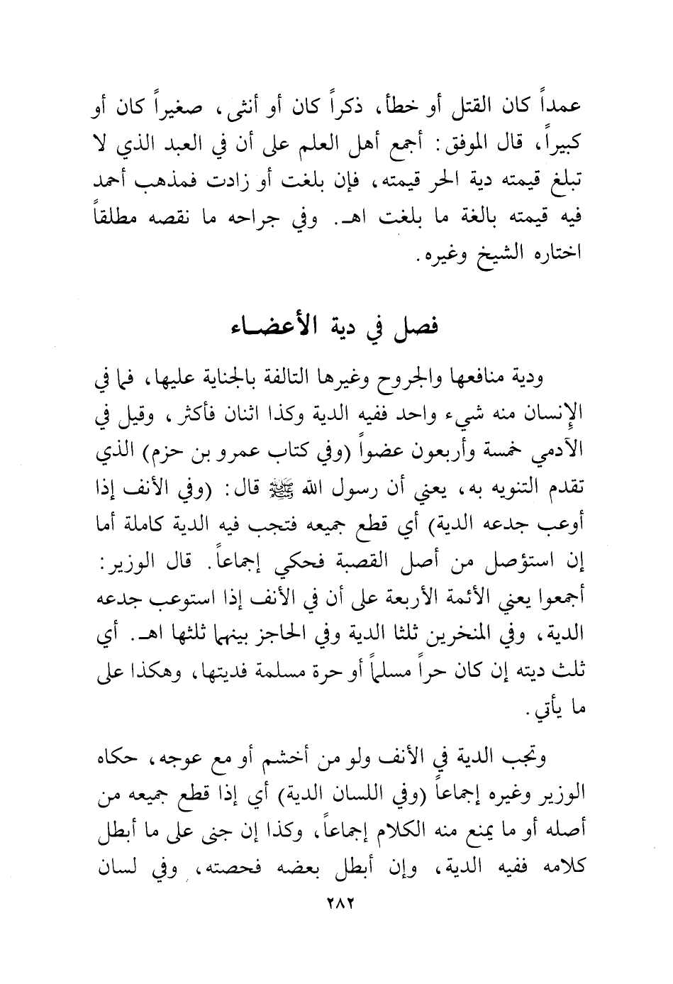 ودية منافعها والجروح وغيرها التالفة بالجناية عليها، فما في الإنسان منه شيء واحد ففيه الدية وكذا اثنان فأكثر، وقيل في الآدمي خمسة وأربعون عضوًا (وفي كتاب عمرو بن حزم) الذي تقدم التنويه به، يعني أن رسول الله - صلى الله عليه وسلم - قال: «وفي الأنف إذا أوعب جدعه الدية» أي قطع جميعها فتجب فيه الدية كاملة أما إن استؤصل من أصل القصبة فحكي إجماعًا، قال الوزير: أجمعوا يعني الأئمة الأربعة على أن في الأنف إذا استوعب جدعه الدية، وفي المنخرين ثلثا الدية وفي الحاجز بينهما ثلثها اهـ، أي ثلث ديته إن كان حرًا مسلمًا أو حرة مسلمة فديتها وهكذا على ما يأتي.