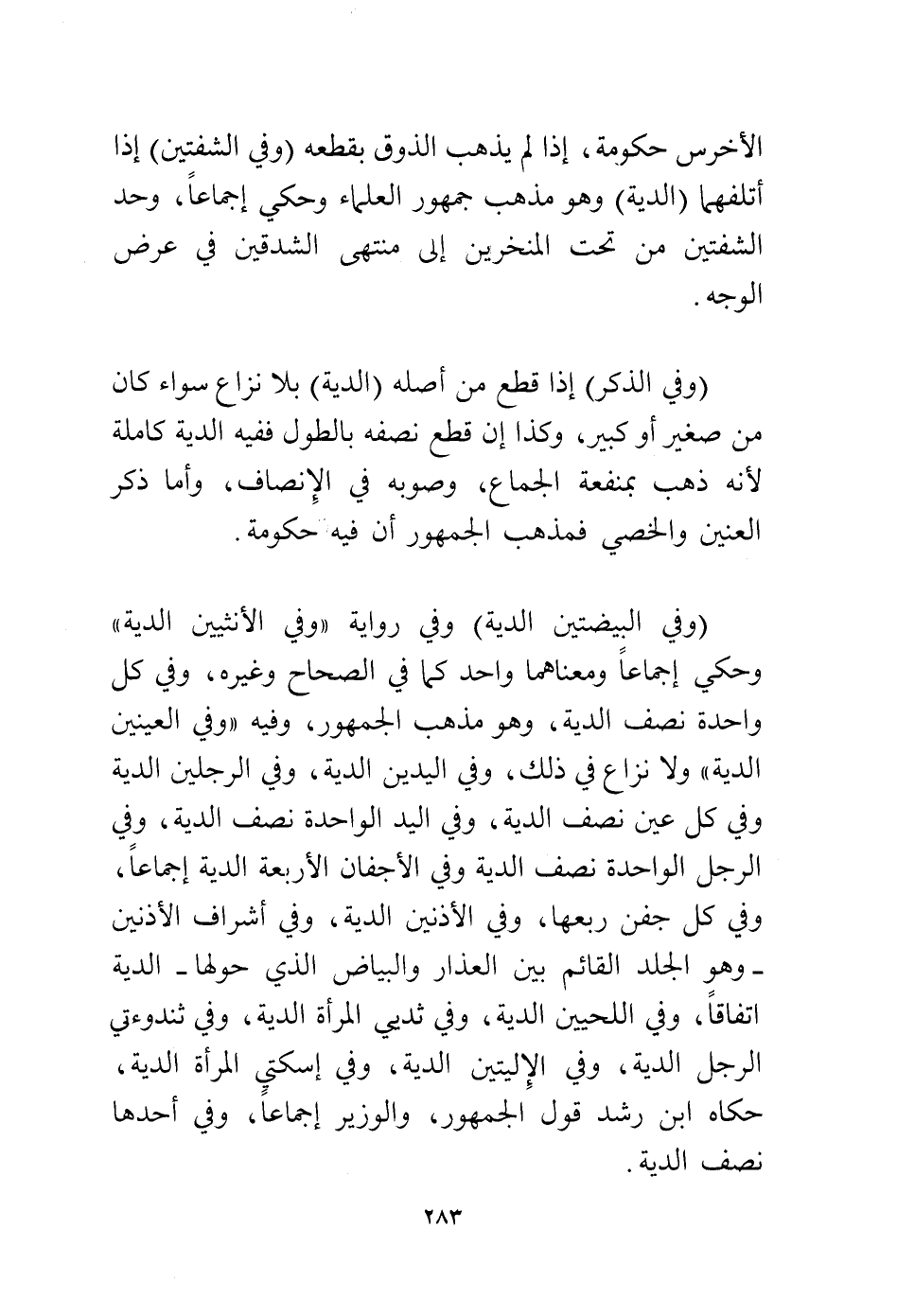 (وفي البيضتين الدية) وفي رواية "وفي الأنثيين الدية" وحكي إجماعًا ومعناهما واحد كما في الصحاح وغيره، وفي كل واحدة نصف الدية، وهو مذهب الجمهور، وفيه «وفي العينين الدية» ولا نزاع في ذلك، وفي اليدين الدية، وفي الرجلين الدية وفي كل عين نصف الدية، وفي اليد الواحدة نصف الدية، وفي الرجل الواحدة نصف الدية وفي الأجفان الأربعة الدية إجماعًا وفي كل جفن ربعها، وفي الأذنين الدية، وفي أشراف الأذنين وهو الجلد القائم بين العذار والبياض الذي حولها الدية اتفاقًا وفي اللحيين الدية، وفي ثديي المرأة الدية، وفي ثندوءتي الرجل الدية، وفي الإليتين الدية، وفي إسكتي المرأة الدية، حكاه ابن رشد قول الجمهور، والوزير إجماعًا وفي أحدها نصف الدية.