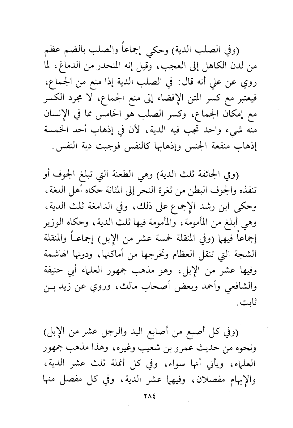 (وفي الصلب الدية) وحكي إجماعًا والصلب بالضم عظم من لدن الكاهل إلى العجب، وقيل إنه المنحدر من الدماغ لما روي عن علي أنه قال: في الصلب الدية إذا منع من الجماع، فيعتبر مع كسر المتن الإفضاء إلى منع الجماع، لا مجرد الكسر مع إمكان الجماع، وكسر الصلب هو الخامس مما في الإنسان منه شيء واحد تجب فيه الدية، لأن في إذهاب أحد الخمسة إذهاب منفعة الجنس وإذهابها كالنفس فوجبت دية النفس.