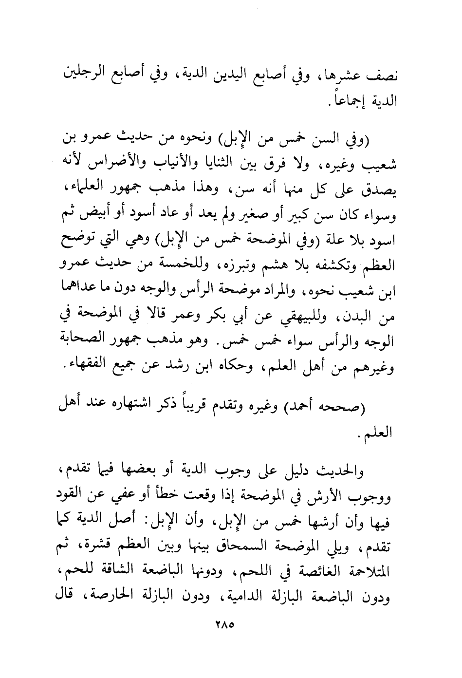 (وفي الموضحة خمس من الإبل) وهي التي توضح العظم وتكشفه بلا هشم وتبرزه، وللخمسة من حديث عمرو ابن شعيب نحوه، والمراد موضحة الرأس والوجه دون ما عداهما من البدن، وللبيهقي عن أبي بكر وعمر قالا في الموضحة في الوجه والرأس سواء خمس خمس، وهو مذهب جمهور الصحابة وغيرهم من أهل العلم، وحكاه ابن رشد عن جميع الفقهاء.