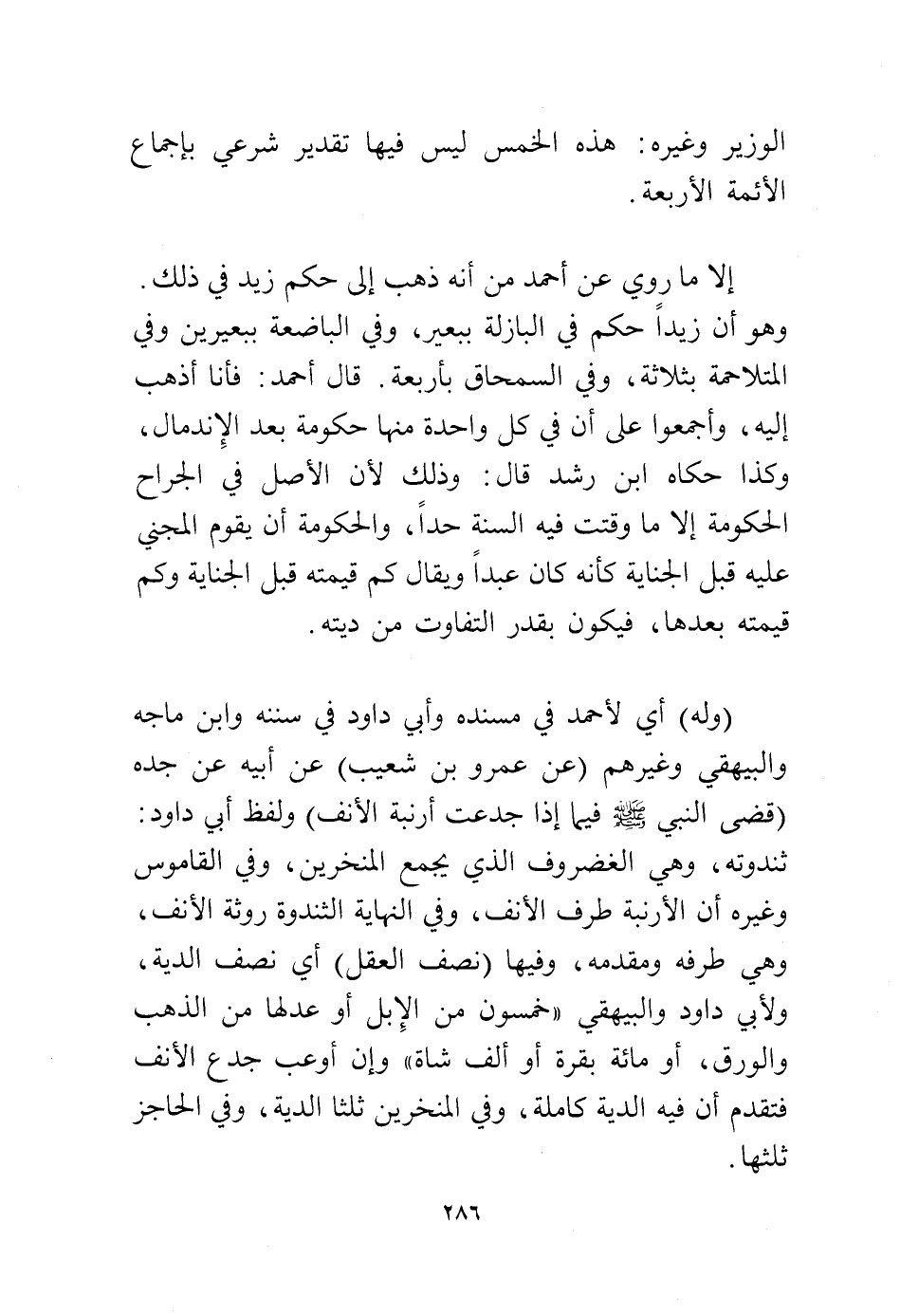 (وله) أي لأحمد في مسنده وأبي داود في سننه وابن ماجه والبيهقي وغيرهم (عن عمرو بن شعيب) عن أبيه، عن جده (قضى النبي - صلى الله عليه وسلم - فيما إذا جدعت أرنبة الأنف) ولفظ أبي داود ثندوته، وهي الغضروف الذي يجمع المنخرين، وفي القاموس وغيره أن الأرنبة طرف الأنف، وفي النهاية الثندوة ورثة الأنف، وهي طرفه ومقدمه، وفيها (نصف العقل) أي نصف الدية، ولأبي داود والبيهقي "خمسون من الإبل أو عدلها من الذهب والورق، أو مائة بقرة أو ألف شاة" وإن أوعب جدع الأنف فتقدم أن فيه الدية كاملة، وفي المنخرين ثلثًا الدية، وفي