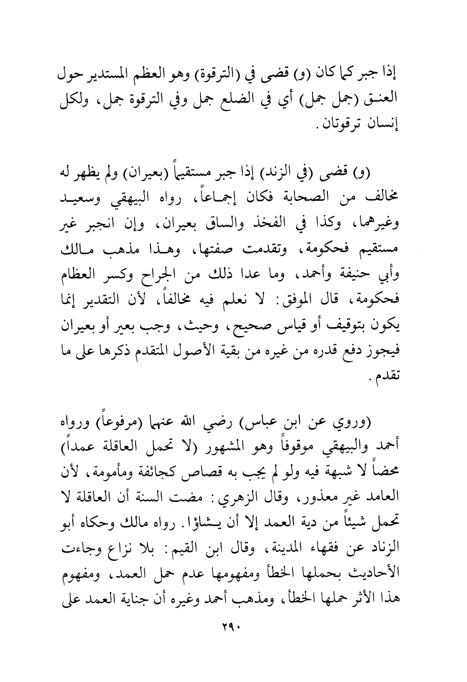 (و) قضى (في الزند) إذا جبر مستقيمًا (بعيران) ولم يظهر له مخالف من الصحابة فكان إجماعًا رواه البيهقي وسعيد وغيرهما، وكذا في الفخذ والساق بعيران، وإن انجبر غير مستقيم فحكومة، وتقدمت صفتها، وهذا مذهب مالك وأبي حنيفة وأحمد، وما عذا ذلك من الجراح وكسر العظام