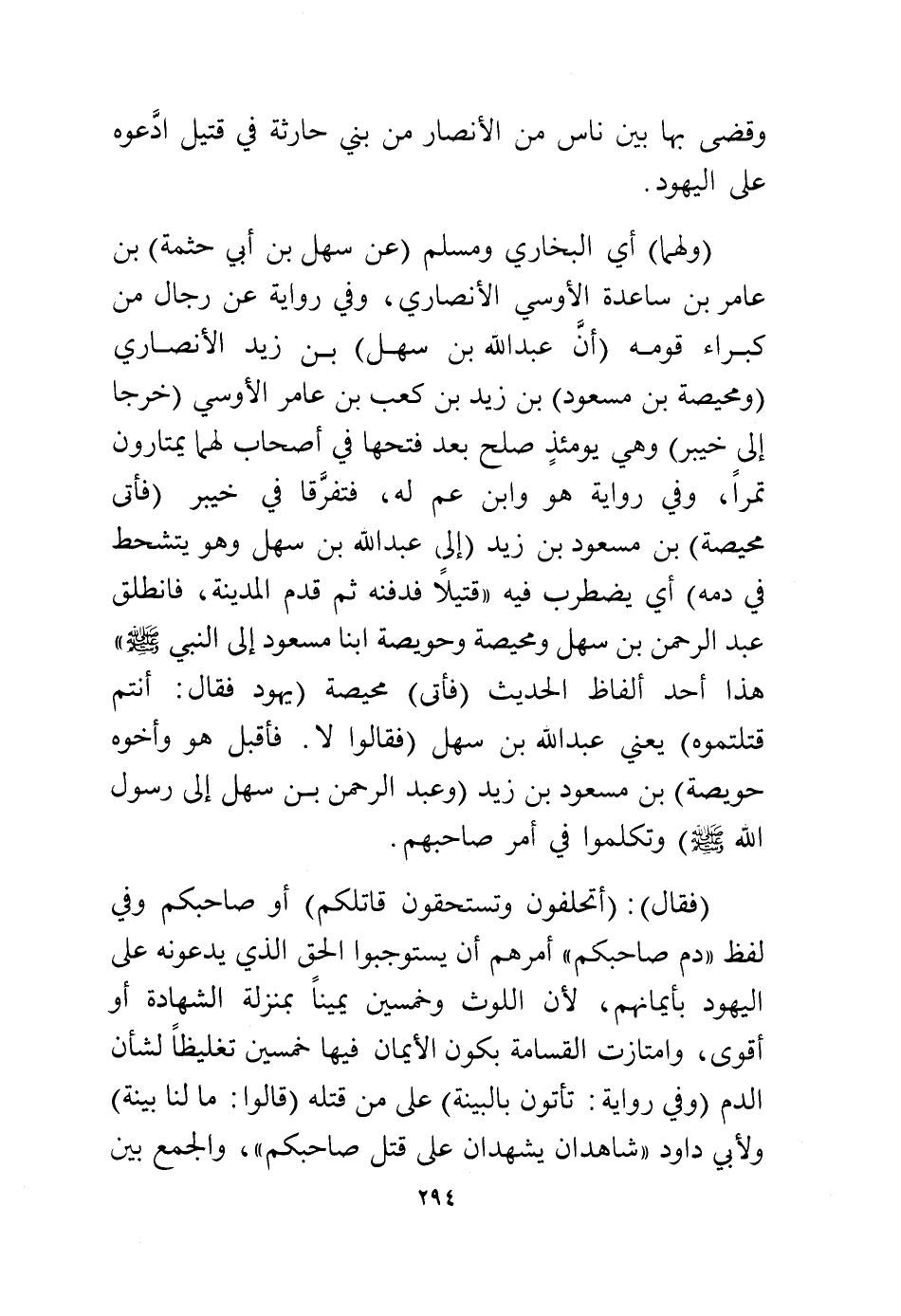 (ولهما) أي البخاري ومسلم (عن سهل بن أبي حثمة) بن عامر بن ساعدة الأوسي الأنصاري، وفي رواية عن رجال من كبراء قومه (أن عبد الله بن سهل) بن زيد الأنصاري (ومحيصة بن مسعود) بن زيد بن كعب بن عامر الأوسي (خرجا إلى خيبر) وهو يومئذ صلح بعد فتحها في أصحاب لهما يمتارون تمرًا، وفي رواية هو وابن عم له، فتفرقا في خيبر (فأتى محيصة) بن مسعود بن زيد (إلى عبد الله بن سهل وهو يتشحط في دمه) أي يضطرب فيه "قتيلاً فدفنه ثم قدم المدينة، فانطلق عبد الرحمن بن سهل ومحيصة وحويصة ابنا مسعود إلى النبي - صلى الله عليه وسلم - هذا أحد ألفاظ الحديث (فأتى) محيصة (يهود فقال: أنتم قتلتموه) يعني عبد الله بن سهل (فقالوا: لا، فأقبل هو وأخوه حويصة) بن مسعود بن زيد (وعبد الرحمن بن سهل إلى رسول الله - صلى الله عليه وسلم -) وتكلموا في أمر صاحبهم.