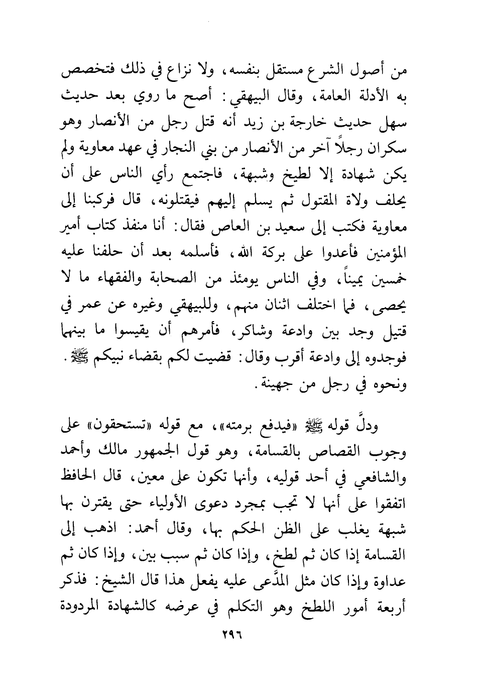 من أصول الشرع مستقل بنفسه، ولا نزاع في ذلك فتخصص به الأدلة العامة، وقال البيهقي: أصح ما روي بعد حديث سهل حديث خارجة بن زيد أنه قتل رجل من الأنصار وهو سكران رجلاً آخر من الأنصار من بني النجار في عهد معاوية ولم يكن شهادة إلا لطيخ وشبهة، فاجتمع رأي الناس على أن يحلف ولاة المقتول ثم يسلم إليهم فيقتلونه، قال فركبنا إلى معاوية فكتب إلى سعيد بن العاص، فقال: أنا منفذ كتاب أمير المؤمنين فأعدوا على بركة الله، فأسلمه بعد أن حلفنا عليه خمسين يمينًا وفي الناس يومئذ من الصحابة والفقهاء ما لا يحصى، فما اختلف اثنان منهم، وللبيهقي وغيره عن عمر في قتيل وجد بين وادعة وشاكر، فأمرهم أن يقيسوا ما بينهما فوجدوه إلى وادعة أقرب وقال: قضيت لكم بقضاء نبيكم - صلى الله عليه وسلم - ونحوه في رجل من