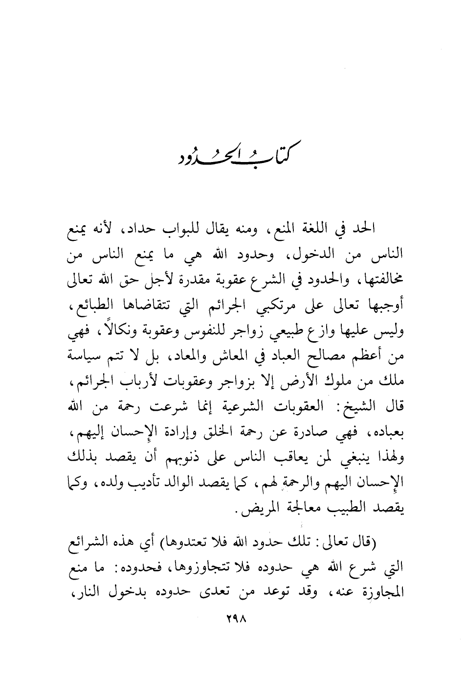 الحد في اللغة المنع، ومنه يقال للبواب حداد، لأنه يمنع الناس من الدخول، وحدود الله هي ما يمنع الناس من مخالفتها، والحدود في الشرع عقوبة مقدرة لأجل حق الله تعالى أوجبها تعالى على مرتكبي الجرائم التي تتقاضاها الطبائع، وليس عليها وازع طبيعي زواجر للنفوس وعقوبة ونكالاً فهي من أعظم مصالح العباد في المعاش والمعاد، بل لا تتم سياسة ملك من ملوك الأرض إلا بزواجر وعقوبات لأرباب الجرائم، قال الشيخ: العقوبات الشرعية إنما شرعت رحمة من الله بعباده، فهي صادرة عن رحمة الخلق، وإرادة الإحسان إليهم ولهذا ينبغي لمن يعاقب الناس على ذنوبهم أن يقصد بذلك الإحسان إليهم والرحمة لهم، كما يقصد الوالد تأديب ولده، وكما يقصد الطبيب معالجة المريض.
