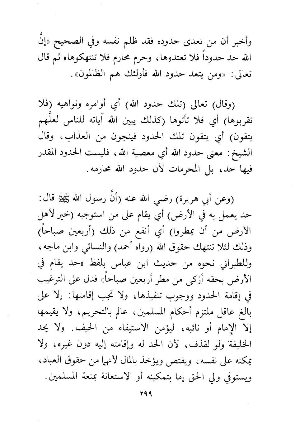 (وعن أبي هريرة) رضي الله عنه (أن رسول الله - صلى الله عليه وسلم - قال: حد يعمل به الأرض) أي يقام على من استوجبه (خير لأهل الأرض من أن يمطروا) أي أنفع من ذلك (أربعين صباحًا) وذلك لئلا تنتهك حقوق الله (رواه أحمد) والنسائي وابن ماجه، وللطبراني نحوه من حديث ابن عباس بلفظ "حد يقام في الأرض بحقه أزكى من مطر أربعين صباحًا" فدل على الترغيب في إقامة الحدود ووجوب تنفيذها، ولا تجب إقامتها: إلا على بالغ عاقل ملتزم أحكام المسلمين عالم بالتحريم، ولا يقيمها إلا الإمام أو نائبه، ليؤمن الاستيفاء من الحيف، ولا يحد الخليفة ولو لقذف، لأن الحد له وإقامته إليه دون غيره، ولا يمكنه على نفسه، ويقتص ويؤخذ بالمال لأنهما من حقوق العباد، ويستوفي ولي الحق إما بتمكينه أو الاستعانة بمنعة المسلمين.