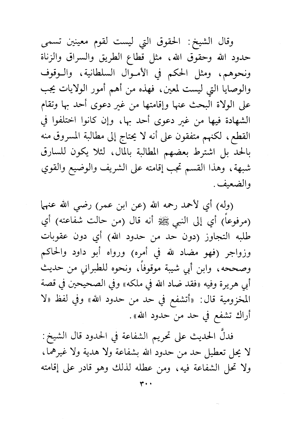 وقال الشيخ: الحقوق التي ليست لقوم معينين تسمى حدود الله، وحقوق الله، مثل قطاع الطريق والسراق والزناة ونحوهم، ومثل الحكم في الأموال السلطانية، والوقوف والوصايا التي ليست لمعين، فهذه من أهم أمور الولايات يجب على الولاة البحث عنها وإقامتها من غير دعوى أحد بها وتقام الشهادة فيها من غير دعوى أحد بها، وإن كانوا اختلفوا في القطع، لكنهم متفقون على أنه لا يحتاج إلى مطالبة المسروق منه بالحد بل اشترط بعضهم المطالبة بالمال، لئلا يكون للسارق شبهة، وهذا القسم تجب إقامته على الشريف والوضيع والقوي والضعيف.