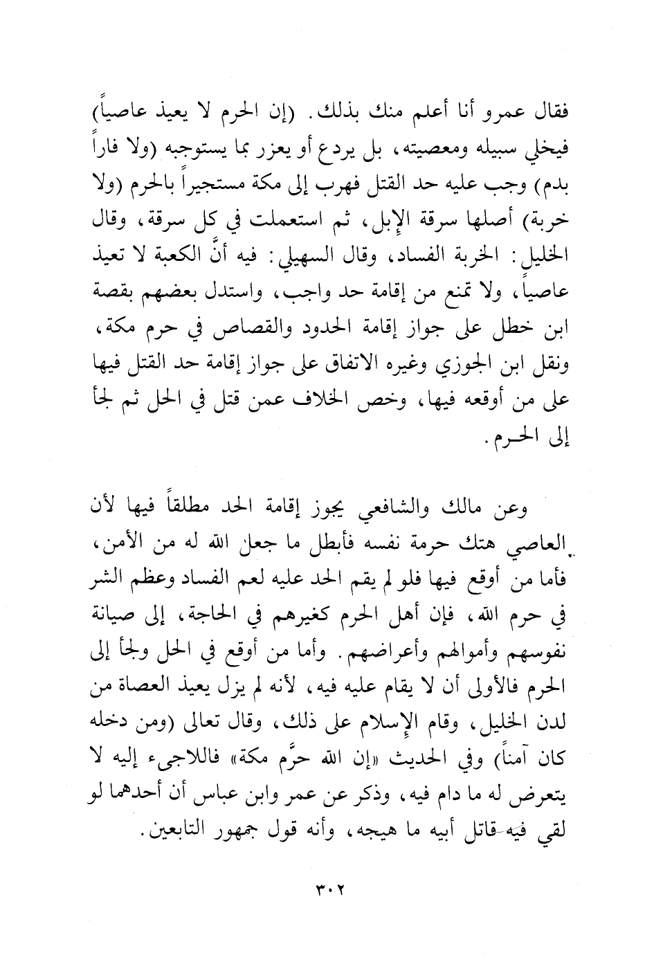 وعن مالك والشافعي يجوز إقامة الحد مطلقًا فيها لأن العاصي هتك حرمة نفسه فأبطل ما جعل الله له من الأمن، فأما من أوقع فيها فلو لم يقم الحد عليه لعم الفساد وعظم الشر في حرم الله، فإن أهل الحرم كغيرهم في الحاجة إلى صيانة نفوسهم وأموالهم وأعراضهم، وأما من أوقع في الحل ولجأ إلى الحرم فالأولى أن لا يقام عليه فيه، لأنه لم يزل يعيذ العصاة من لدن الخليل، وقام الإسلام على ذلك، وقال تعالى: {وَمَنْ دَخَلَهُ كَانَ آمِنًا} وفي الحديث "إن الله حرم مكة" فاللاجئ إليه لا يتعرض له ما دام فيه، وذكر عن عمر وابن عباس أن أحدهما لو لقي فيه قاتل أبيه ما هيجه، وأنه قول جمهور التابعين.