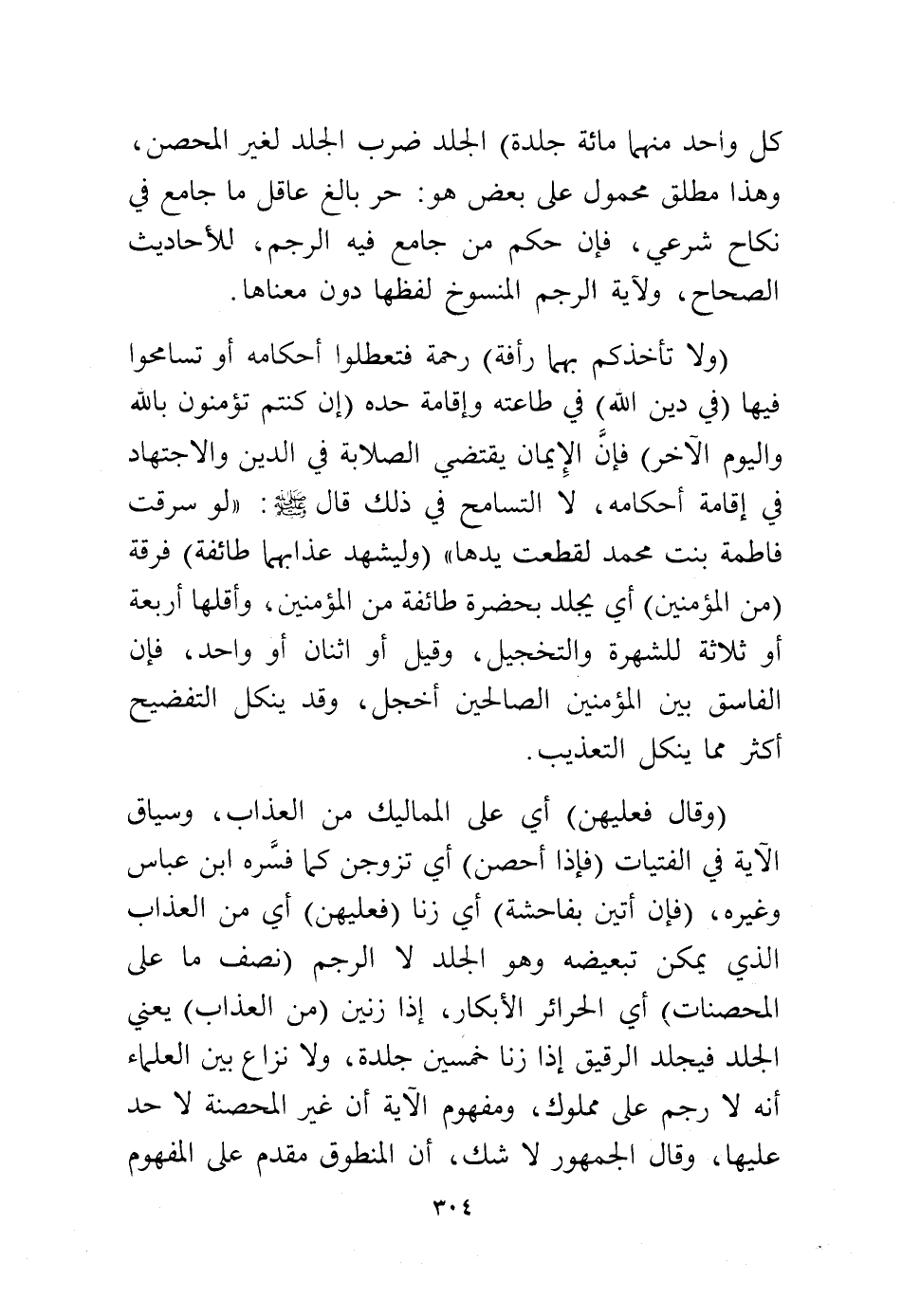 {وَلَا تَأْخُذْكُمْ بِهِمَا رَأْفَةٌ فِي دِينِ اللهِ} في طاعته وإقامة حده {إِنْ كُنْتُمْ تُؤْمِنُونَ بِاللهِ وَالْيَوْمِ الْآخِرِ} فإن الإيمان يقتضي الصلابة في الدين والاجتهاد في إقامة أحكامه، لا التسامح في ذلك قال - صلى الله عليه وسلم - «لو سرقت فاطمة بنت محمد لقطعت يدها» (وليشهد عذابهما طائفة) فرقة (من المؤمنين) أي يجلد بحضرة طائفة من المؤمنين، وأقلها أربعة أو ثلاثة للشهرة والتخجيل، وقيل أو اثنان أو واحد، فإن الفاسق بين المؤمنين الصالحين أخجل وقد ينكل التفضيح أكثر مما ينكل التعذيب.