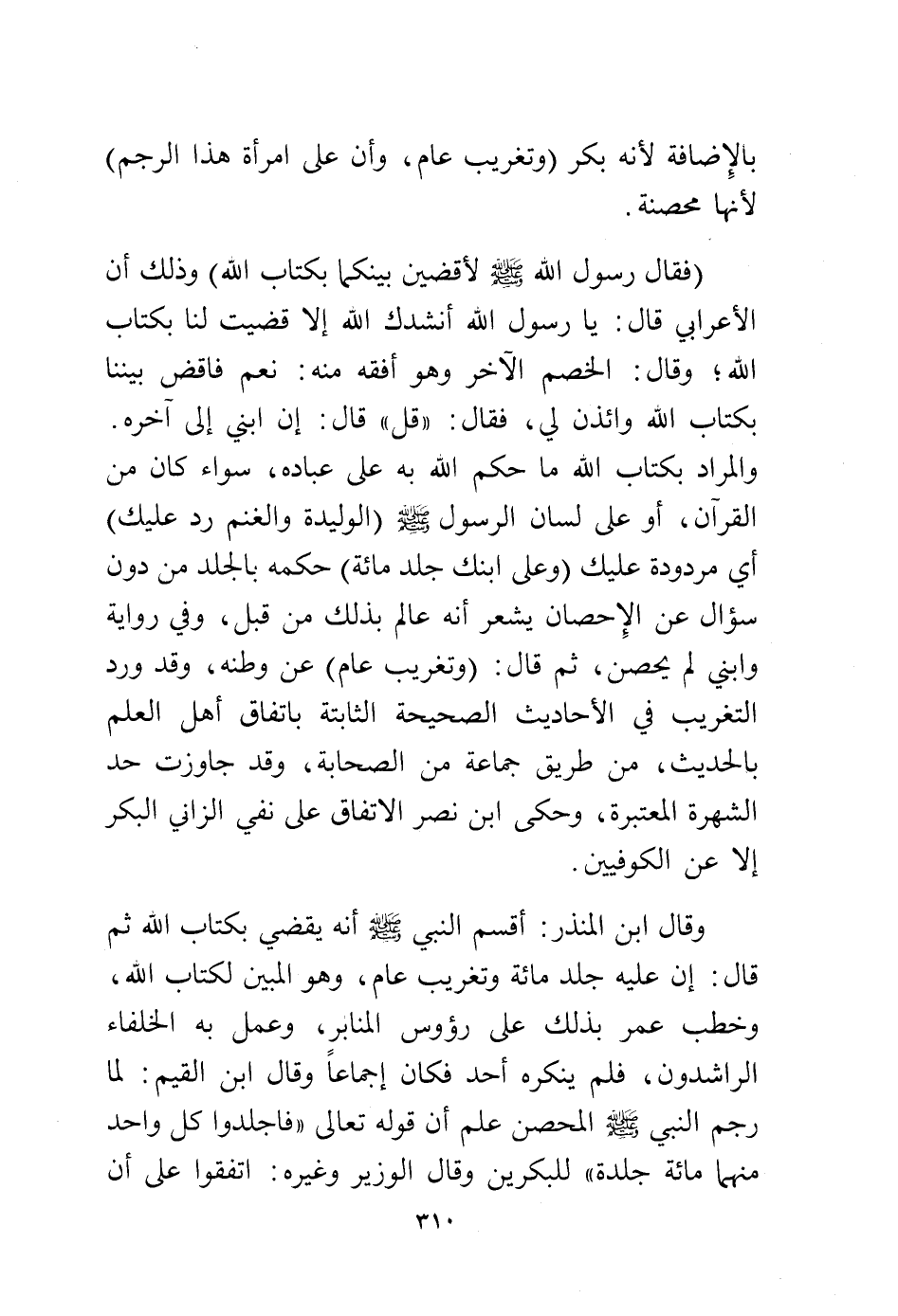 (فقال رسول الله - صلى الله عليه وسلم - لأقضين بينكما بكتاب الله) وذلك أن الأعرابي قال: يا رسول الله أنشدك الله إلا قضيت لنا بكتاب الله؛ وقال: الخصم الآخر وهو أفقه منه: نعم فاقض بيننا بكتاب الله وأذن لي، فقال: «قل» قال: إن ابني إلى آخره، والمراد بكتاب الله ما حكم الله به على عباده، سواء كان من القرآن، أو على لسان الرسول - صلى الله عليه وسلم - «الوليدة والغنم رد عليك» أي مردودة عليك «وعلى ابنك جلد مائة» حكمه بالجلد من دون سؤال عن الإحصان يشعر أنه عالم بذلك من قبل، وفي رواية وابني لم يحصن، ثم قال: (وتغريب عام) عن وطنه، وقد ورد التغريب في الأحاديث الصحيحة الثابتة باتفاق أهل العلم بالحديث، من طريق جماعة من الصحابة، وقد جاوزت حد الشهرة المعتبرة، وحكى ابن نصر الاتفاق على نفي الزاني البكر إلا عن الكوفيين.