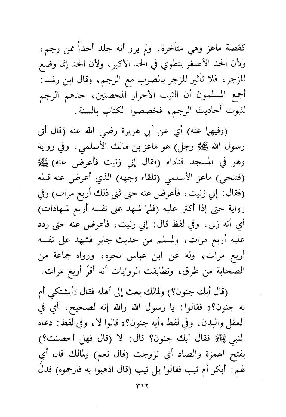 (قال أبك جنون؟) ولمالك بعث إلى أهله فقال: «أيشتكي أم به جنون؟» فقالوا: يا رسول الله والله إنه لصحيح، أي في العقل والبدن، وفي لفظ «أبه جنون؟» قالوا: لا، وفي لفظ: دعاه النبي - صلى الله عليه وسلم - فقال: «أبك جنون؟» قال: لا، «فهل أحصنت؟» بفتح الهمزة والصاد أي تزوجت (قال: نعم) ولمالك قال أي لهم: أبكر أم ثيب فقالوا بل ثيب (قال: اذهبوا به فارجموه) فدل