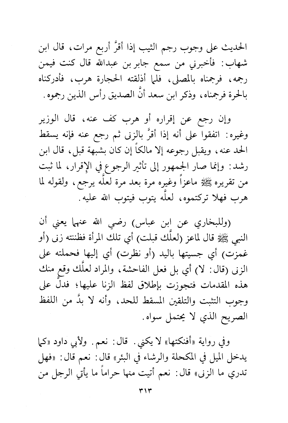 الحديث على وجوب رجم الثيب إذا أقر أربع مرات قال ابن شهاب: فأخبرني من سمع جابر بن عبد الله قال: كنت فيمن رجمه، فرجمناه بالمصلي، فلما أذلقته، الحجارة هرب، فأدركناه بالحرة فرجمناه، وذكر ابن سعد أن الصديق رأس الذين رجموه.
