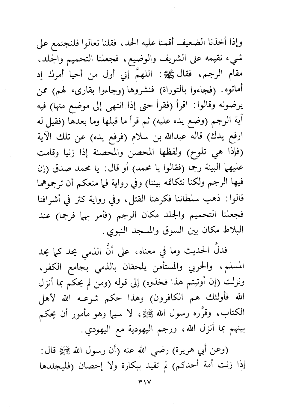 فدل الحديث وما في معناه، على أن الذمي يحد كما يحد المسلم، والحربي والمستأمن يلحقان بالذمي بجامع الكفر، ونزلت {إِنْ أُوتِيتُمْ هَذَا فَخُذُوهُ} على قوله: {وَمَنْ لَمْ يَحْكُمْ بِمَا أَنْزَلَ اللهُ فَأُولَئِكَ هُمُ الْكَافِرُونَ *} وهذا حكم شرعه الله لأهل الكتاب، وقرره رسول الله - صلى الله عليه وسلم -، لا سيما وهو مأمور أن يحكم بينهم بما أنزل الله ورجم اليهودية مع اليهودي.