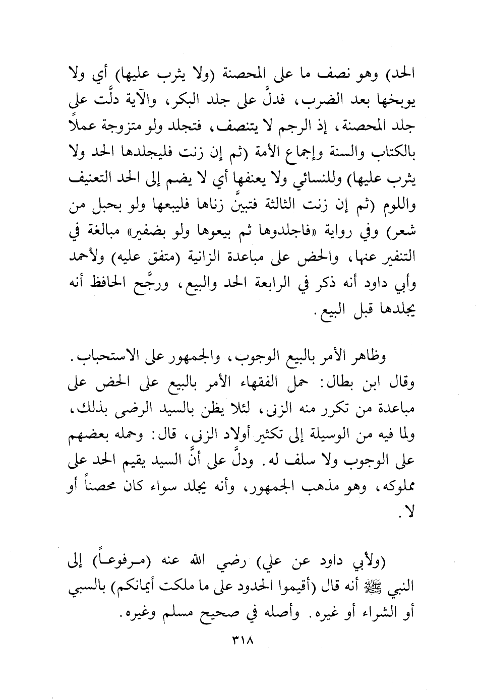 (ولأبي داود عن علي) رضي الله عنه (مرفوعًا) إلى النبي - صلى الله عليه وسلم - أنه قال: «أقيموا الحدود على ما ملكت أيمانكم» بالسبي أو الشراء أو غيره، وأصله في صحيح مسلم وغيره.